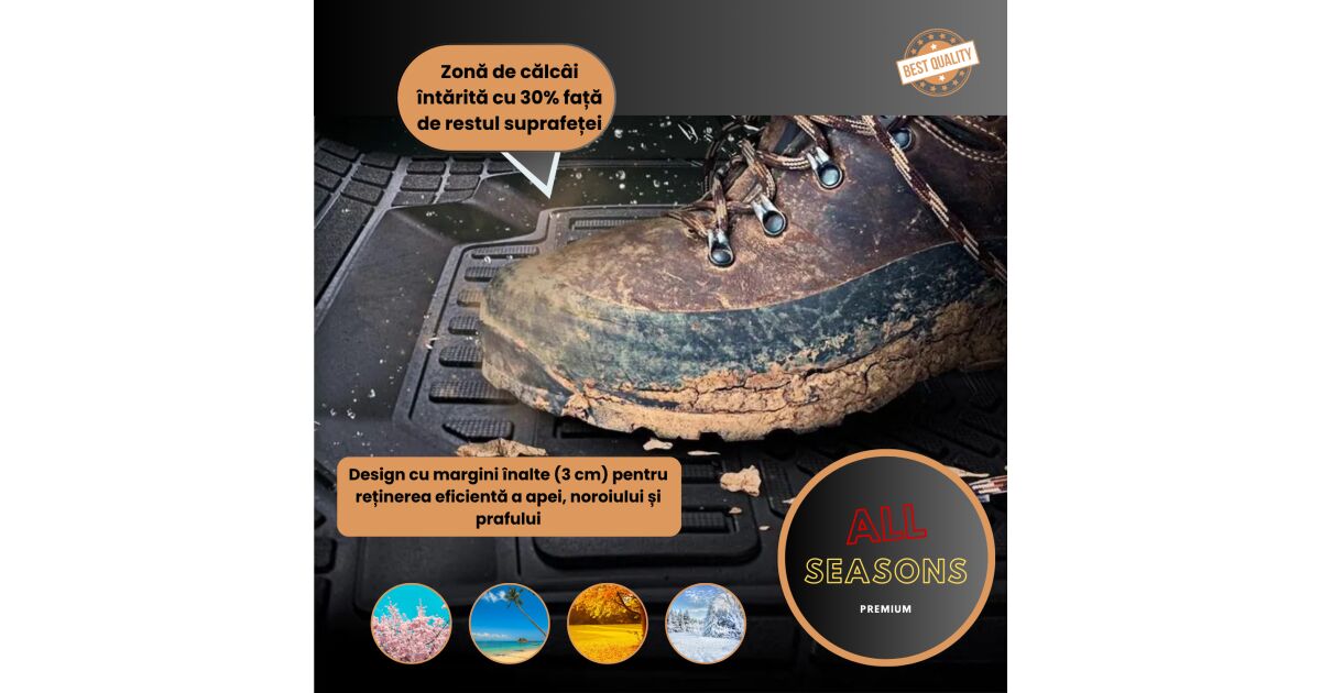 - 🛡️ Protecție Eficientă: Marginea înălțată de 3 cm reține apa, noroiul și praful, prevenind deteriorarea mochetei originale.