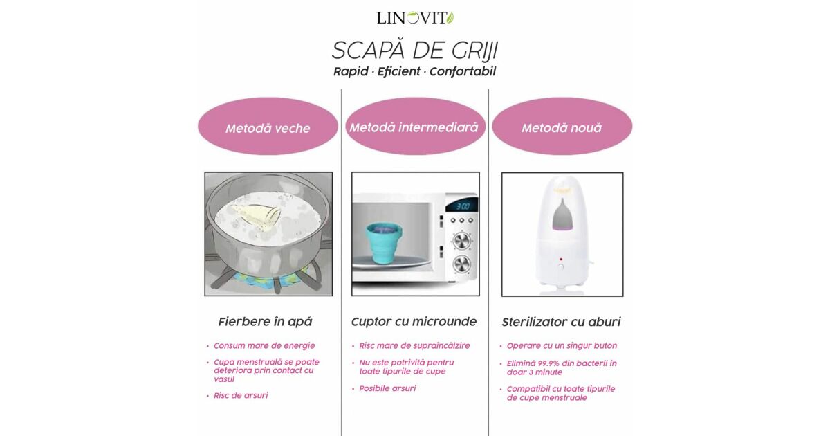 Set Sterilizator Cupe Menstruale + 2 Cupe Menstruale Reutilizabile 25ml & 30ml, Linovit®, Dispozitiv de Igienizare cu Aburi Compatibil cu Majoritatea Cupelor Menstruale, 100% Silicon Medical, Descriere