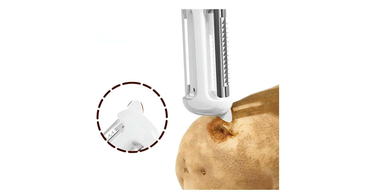 Dispozitivul nostru are inclus: un deschizator de sticle, un curățător de legume/fructe , care poate de asemenea să le felieze,o lamă la capăt cu ajutorul căreia se pot deschide conservele și un cuțit de tăiat fructe.