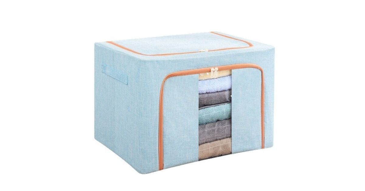 Cutie de Depozitare Pliabila, KipHome, 66 L, din Bumbac si In, 50x40x33 cm, Fereastra Frontala, 2 Usi de Acces cu Fermoar Bidirectional, Cadru Metalic, Suport Baza Stabil din Plastic, Bleu Descriere