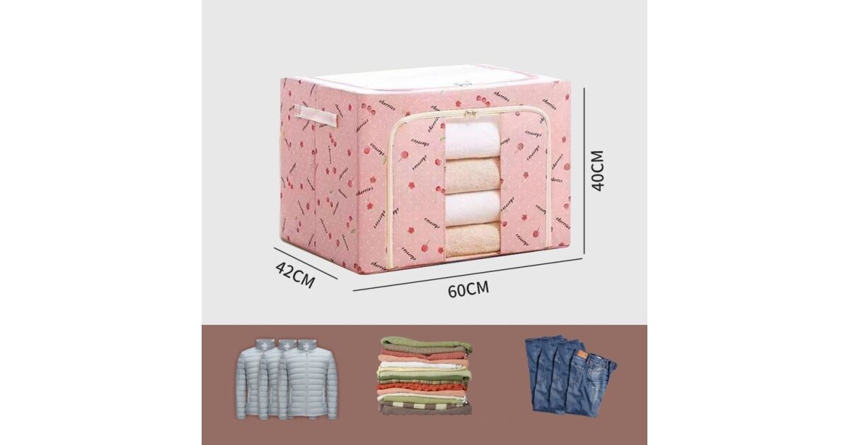 -Cutie de Depozitare Pliabila, KipHome, Cu Fermoar, 100 L, Textil, 60x42x40 cm, cu Fereastra, Cadru Metalic, Suport Baza Stabil din Plastic, Imprimeu Cirese, Roz Descriere