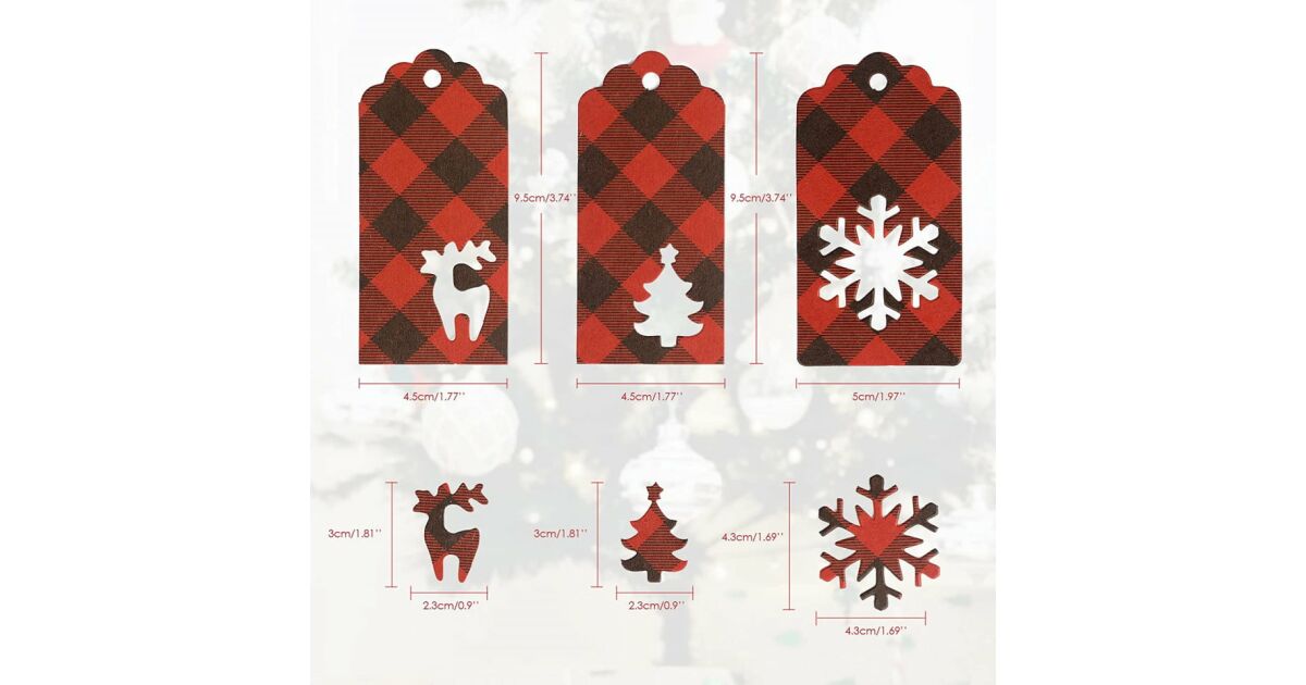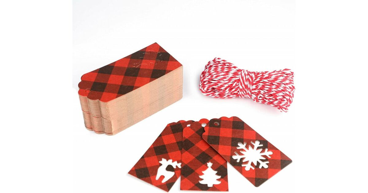 Etichete cadouri Crăciun: 150 etichete cu șnur, design tartan roșu-negru 🎁🎄