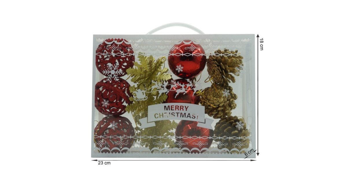 Set de 12 ornamente de brad, KipHome, de tip Glob, Rosu/ Auriu, din plastic, cu finisaj sclipitor , cutie 6 cm adancime x 23 cm lungime x 18 cm inaltime
