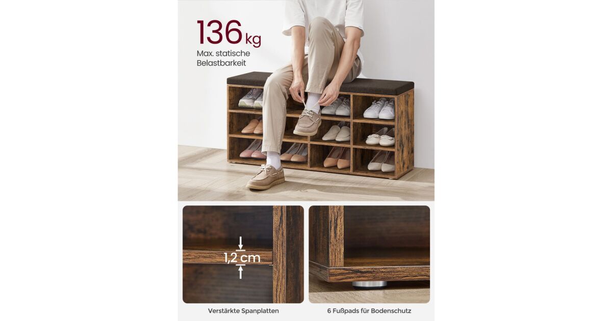 Banchetă depozitare pantofi, 12 compartimente, cu șezut căptușit maro rustic 104x30x48cm Descriere