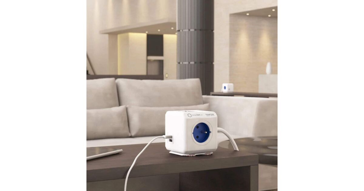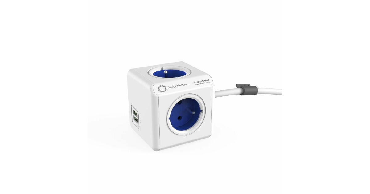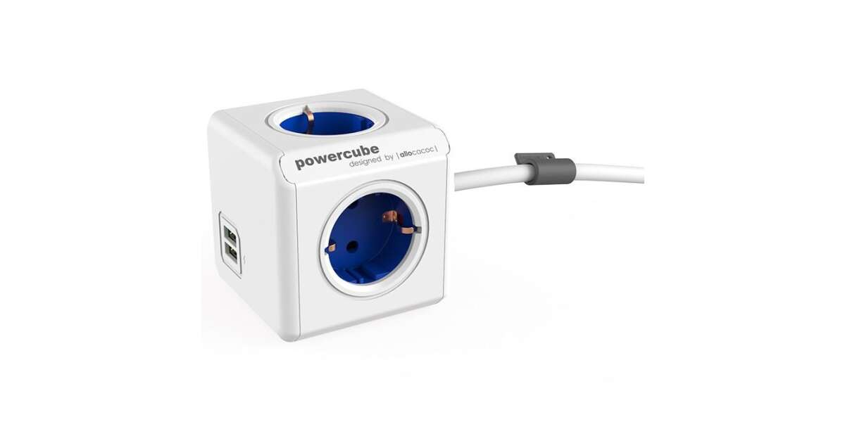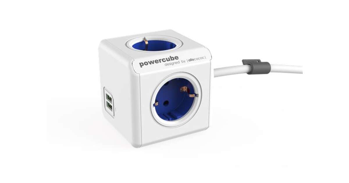 Prelungitor cubic, Powercube by Allocacoc, 2xUSB, 4 prize, 3m, alb/albastru Descriere