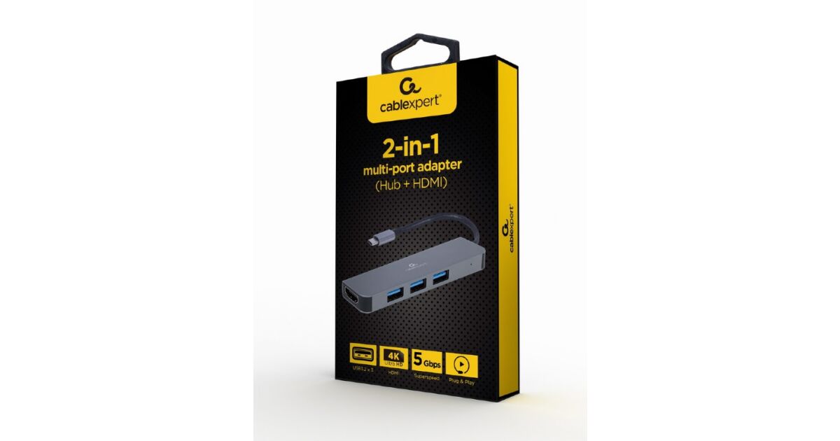 -Adaptor USB tip C, interfata USB 3.2 gen.1, multifunctional, Cablexpert 12144, port HDMI 4K, HUB 3 x USB, gri (A-CM-COMBO2-01) (A-CM-COMBO2-01) Descriere