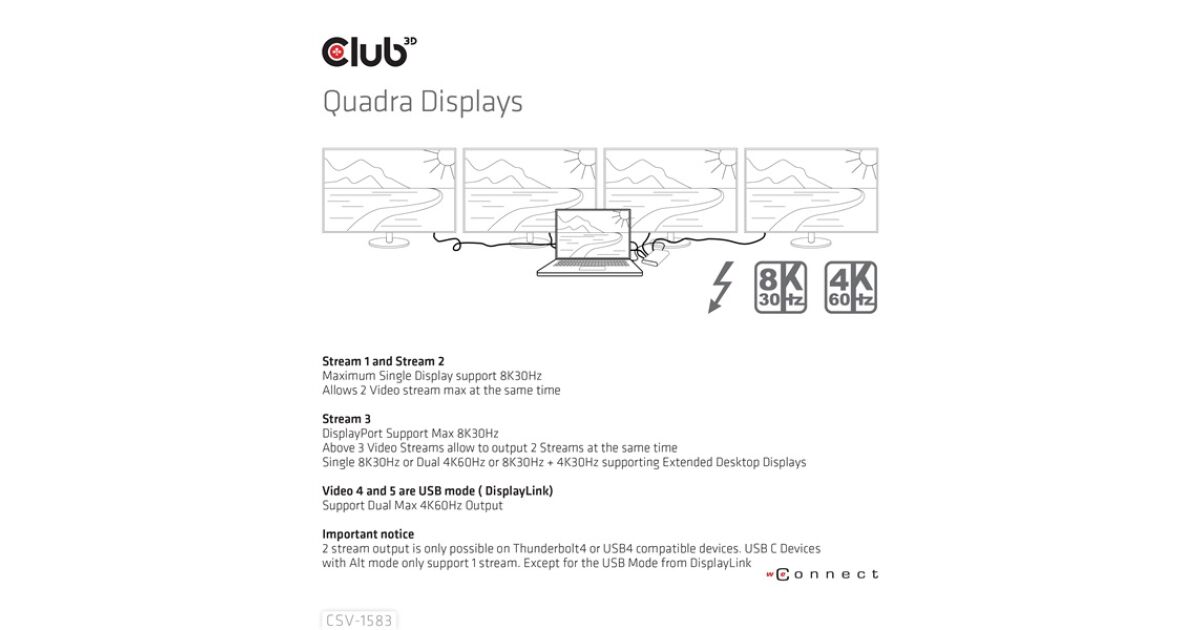 Club3D CSV-1583 este o stație de andocare certificată Thunderbolt™ 4 care permite conectarea simultană a până la 4 ecrane. Este alegerea ideală pentru profesioniști și pentru toți cei care doresc să profite la maximum de laptopul sau computerul lor.