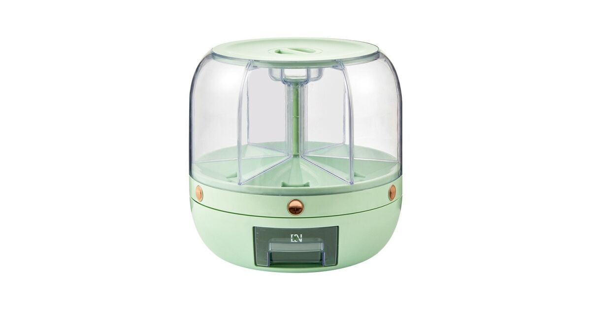 Dozator de cereale KipHome, rotativ 360, 6 compartimente, capacitate 6 L, rezistent la umezeala, inchidere etansa, verde deschis Descriere