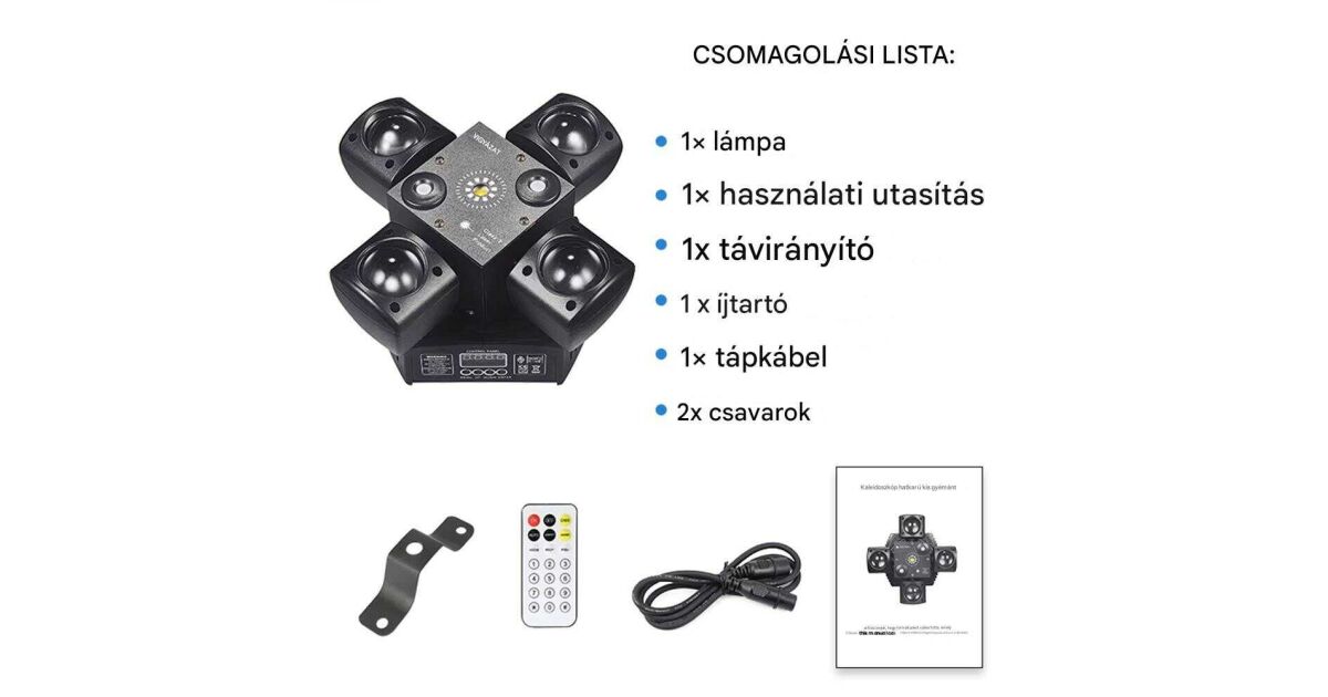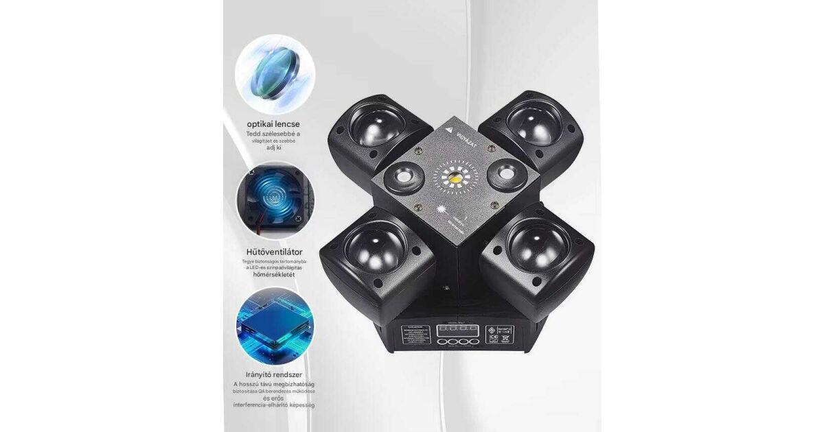 Încinge petrecerile cu acest uimitor laser disco light cu cap rotativ cu 4 brațe! Cu funcția de stroboscop, sursa de lumină LED RGBW și telecomanda, atmosfera de neuitat este garantată. Este alegerea perfectă pentru petreceri acasă, DJ, organizatori de evenimente, baruri și cluburi.