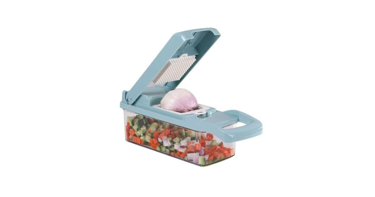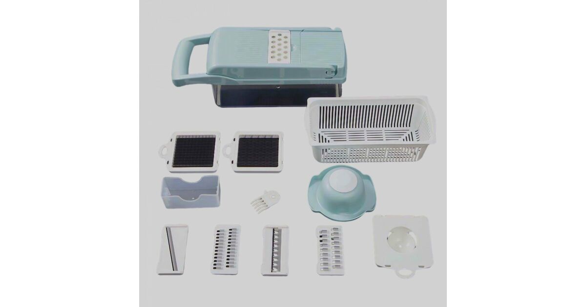 Feliator Multifunctional, KipHome, Razatoare, 8 in 1, pentru Fructe si Legume, 10 Piese, Lame de Inox, Recipient Stocare, Separator Oua, Protectie Mana, ABS, 32.2x11.3 cm, Albastru/Alb Descriere