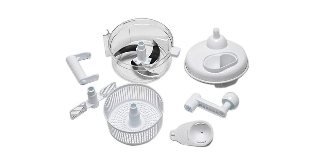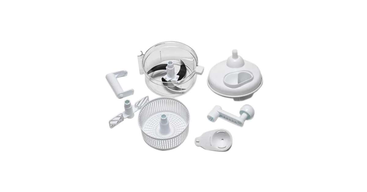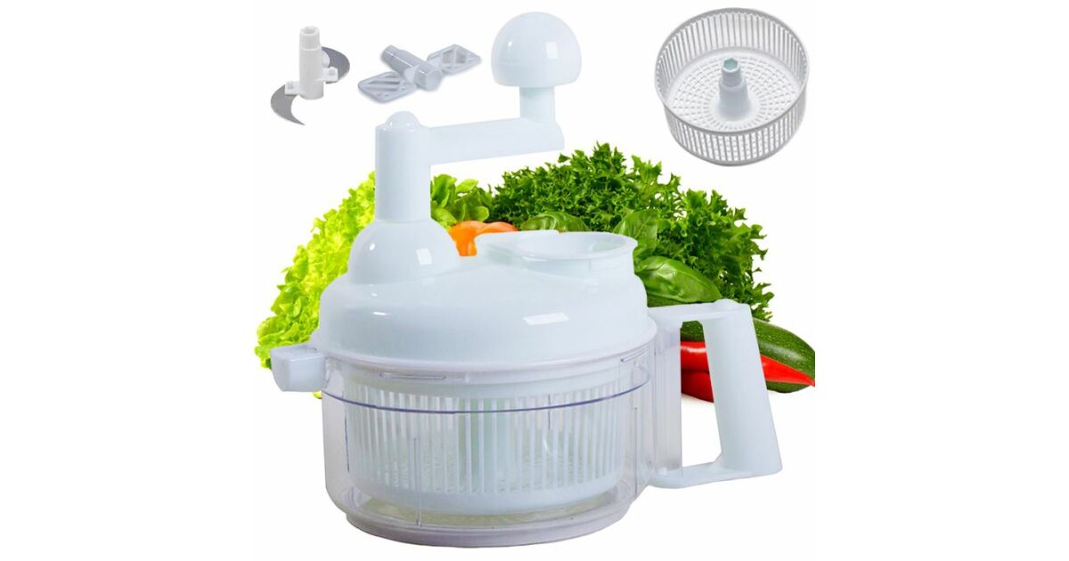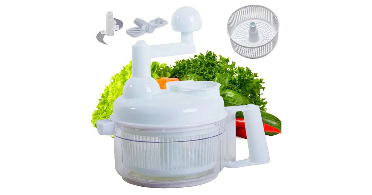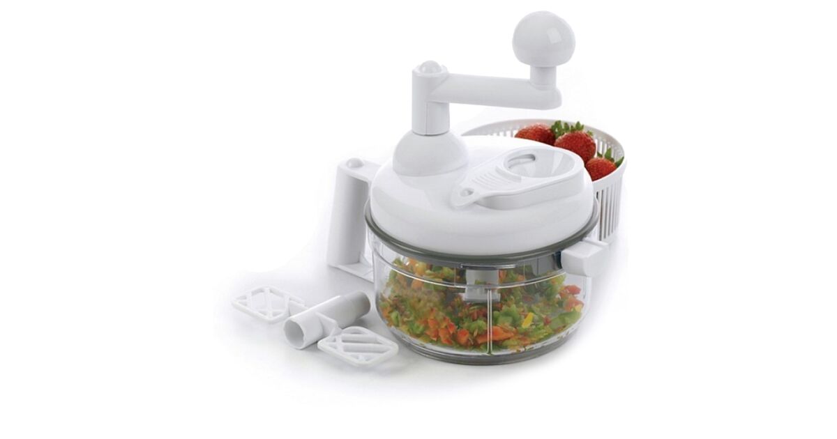 Acest ajutor de bucătărie manual practic este alegerea perfectă pentru prepararea rapidă și ușoară a alimentelor. Tocați legume, fructe, carne, faceți spumă, amestecați aluat și uscați-vă salata – totul cu un singur dispozitiv!