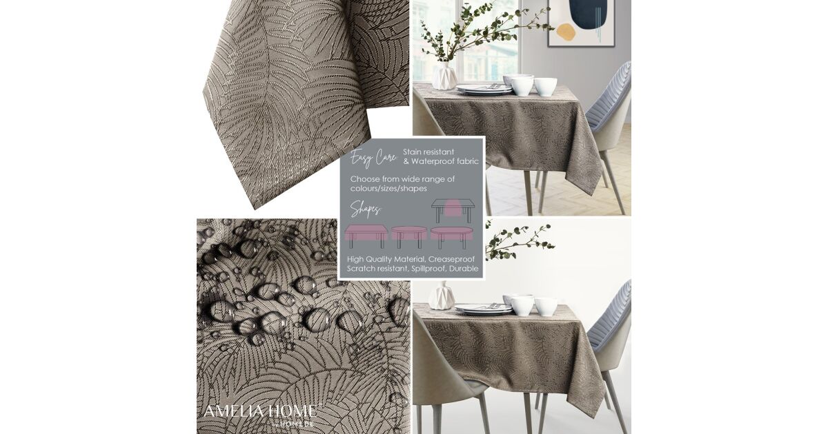 Această față de masă deosebită este disponibilă sub marca AmeliaHome și este disponibilă în nuanța "Cappuccino", o culoare care se potrivește perfect interioarelor moderne, minimaliste și adaugă căldură și eleganță sufrageriei sau bucătăriei de acasă. Fețele de masă Cappuccino se potrivesc cu materialele naturale și mobilierul din lemn, dar se armonizează bine și cu elementele metalice moderne.