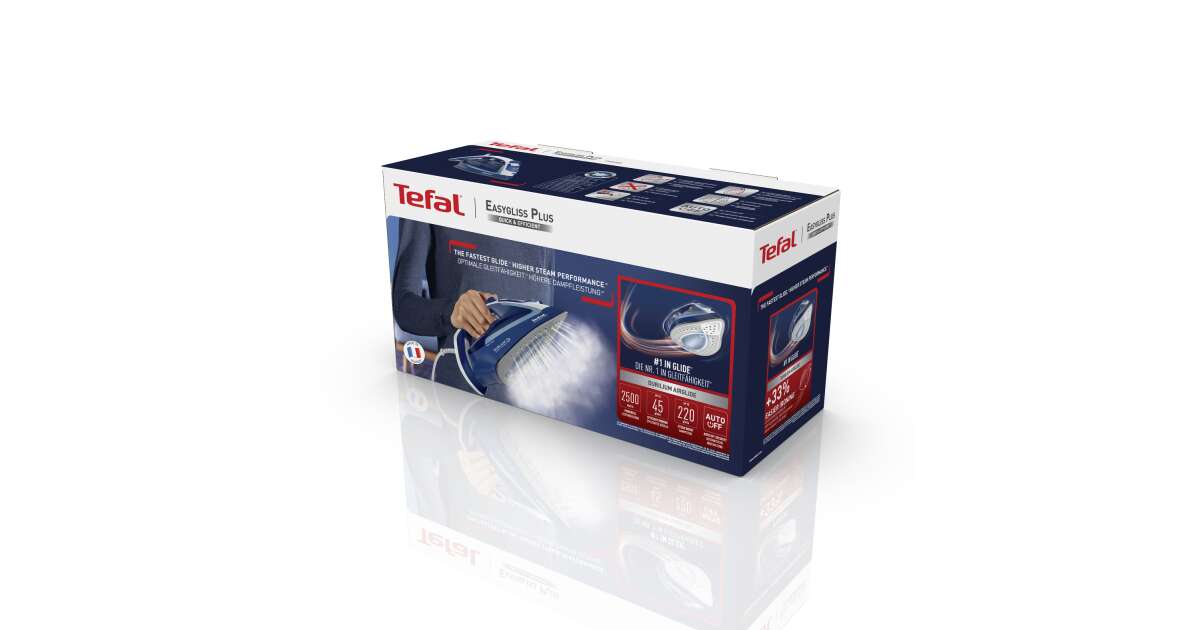 Fier de calcat TEFAL EasyGliss Plus FV5735E0, 2500W, 220g/min, Easygliss Plus , Durilium AirGlide, sistem anticalcar, functie calcare verticala, Auto OFF, Autosteam, alb&albastru Descriere