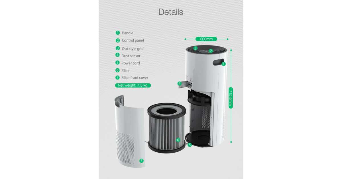 - Filtrare 3 în 1: Pre-filtru (păr, păr de animale), filtru HEPA (polen, 99,5% din bacterii), filtru cu carbon activ (mirosuri, fum).