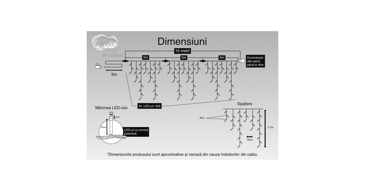 Cortină Lumini LED Crăciun - 15 metri, 429 LED-uri, Multicolor