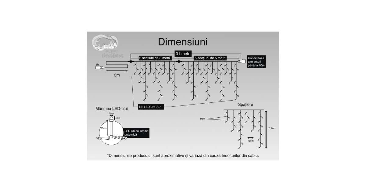 - 🎄 31 metri lungime: Perfectă pentru a împodobi casa, grădina sau chiar bradul de Crăciun.