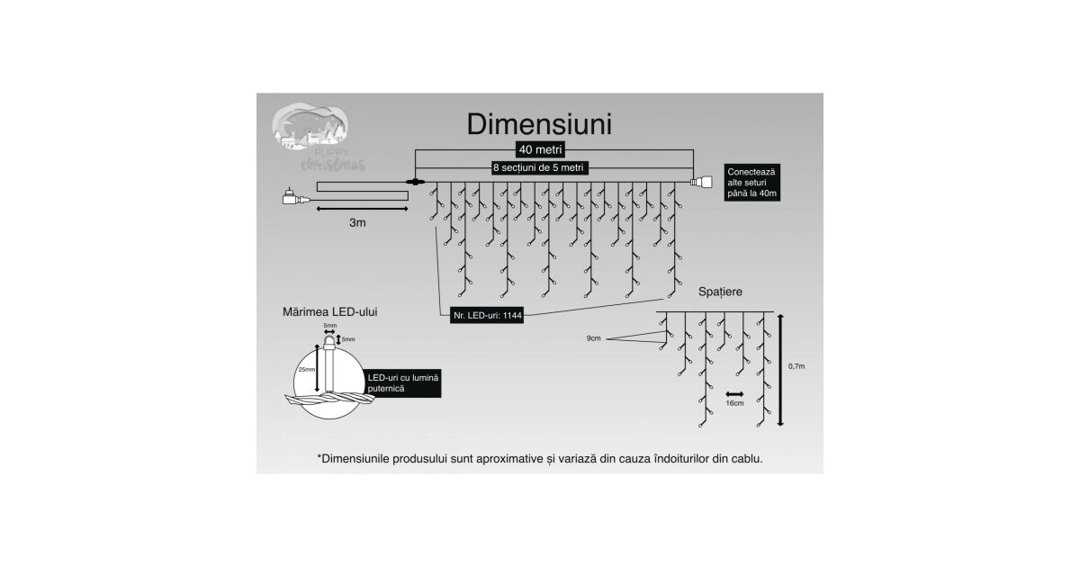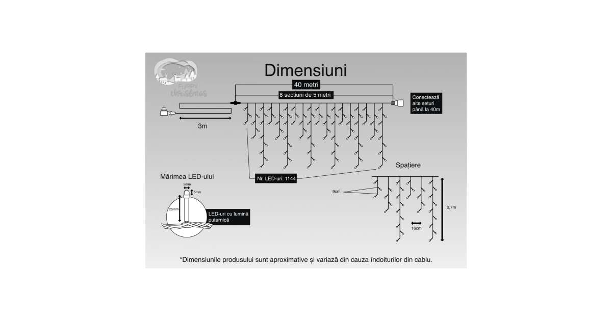 Instalatie Craciun, 40 m, 1144 Led-uri ,Franjuri, Rosu / Verde/ Albastru, Flash, Transformator, Interconectabila, Prelungitor 3 m inclus, Fir Negru, KipHome Descriere