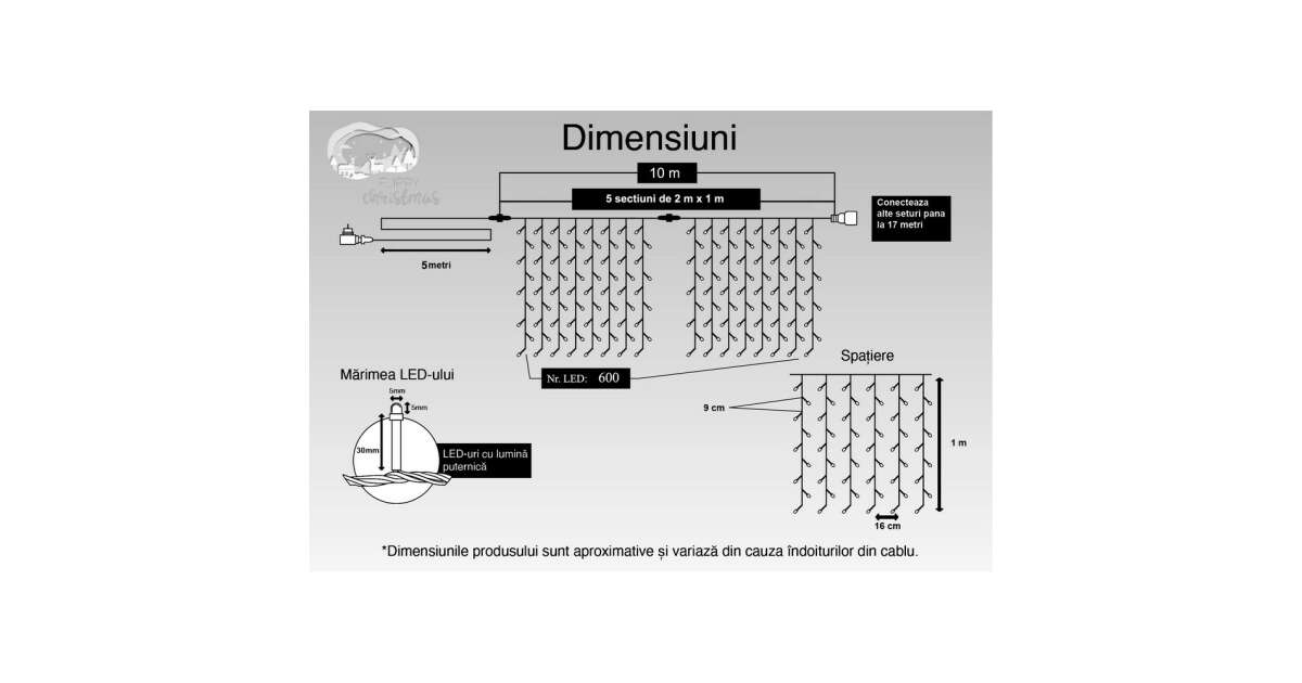 Instalatie Craciun, Tip Perdea, IP44, 10 m x 1 m, 600 LED-uri, Alb cald, cu flash, Transformator, Interconectabila, Prelungitor 5 m inclus, Fir transparent, Interior/ Exterior, KipHome Descriere