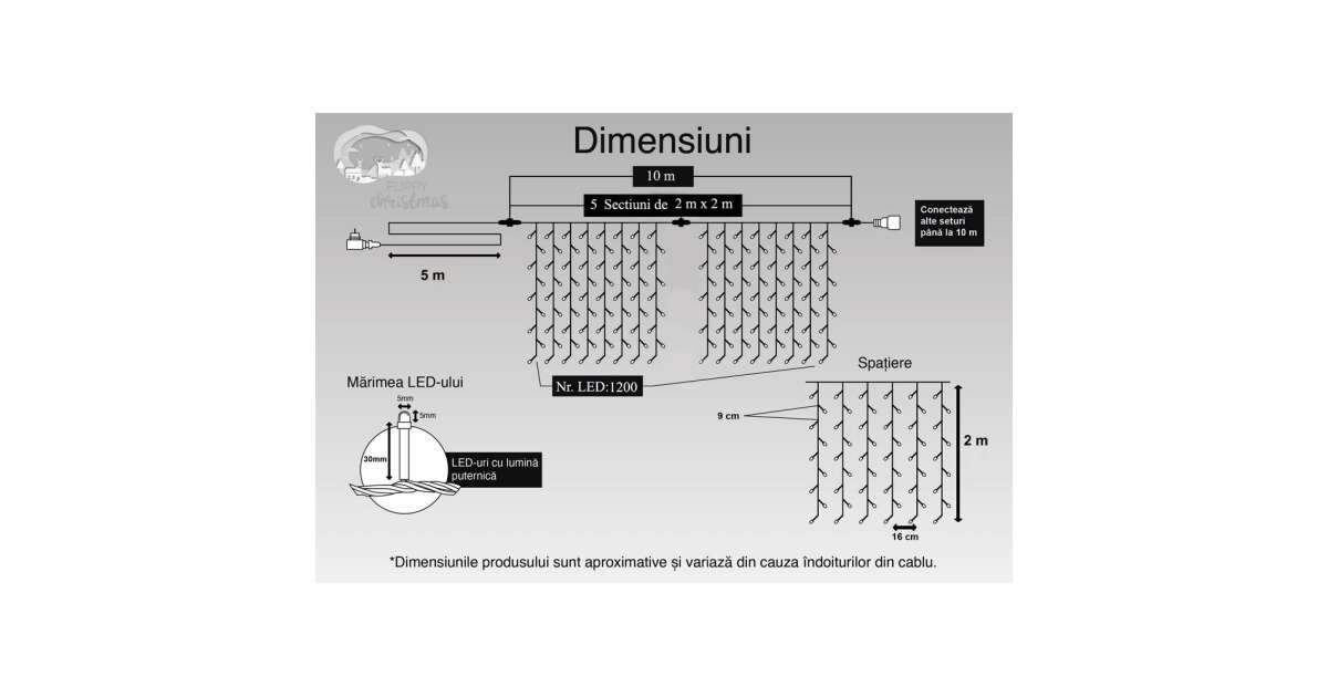 Instalatie Craciun, Tip Perdea, IP44, 10 m x 2 m, 1200 LED-uri, Alb rece, 8 jocuri de lumini, Transformator, Interconectabila, Prelungitor 5 m inclus, Fir transparent, Interior/ Exterior, Kip Descriere