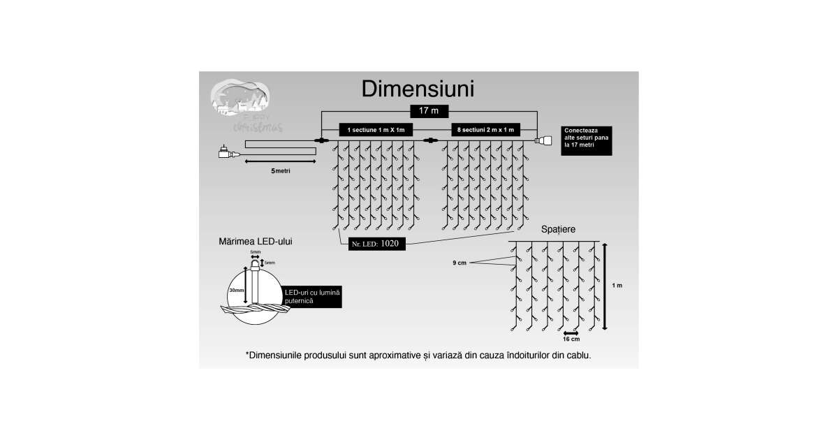 Instalatie Craciun, Tip Perdea, IP44, 17 m x 1 m, 1020 LED-uri, Albastru, cu flash, Transformator cu telecomanda, Interconectabila, Prelungitor 5 m inclus, Fir transparent, Interior/ Exterior Descriere