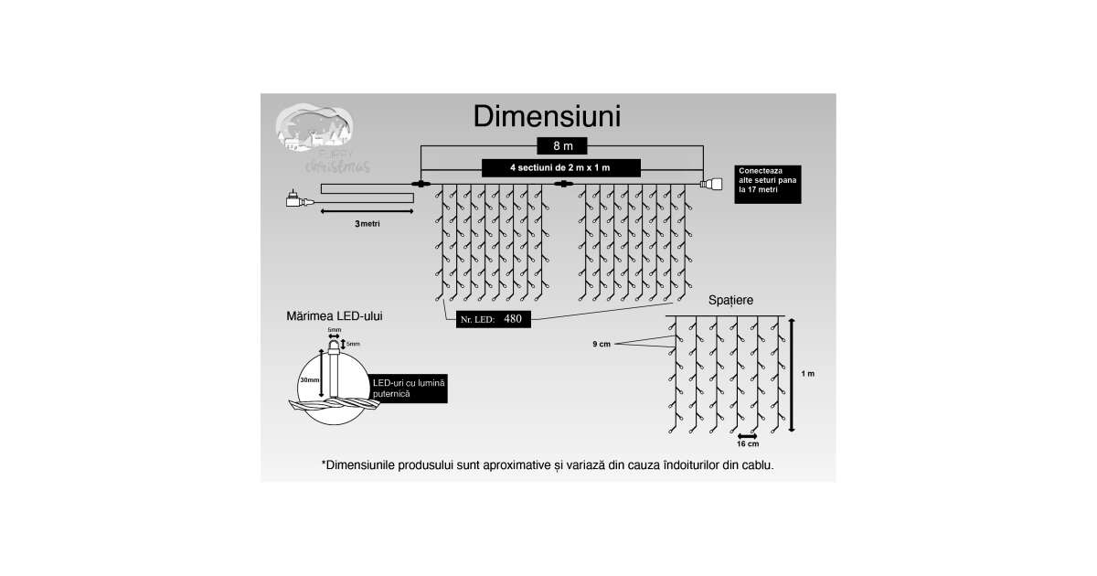 - Cortină luminoasă de 8 metri lungime și 1 metru lățime