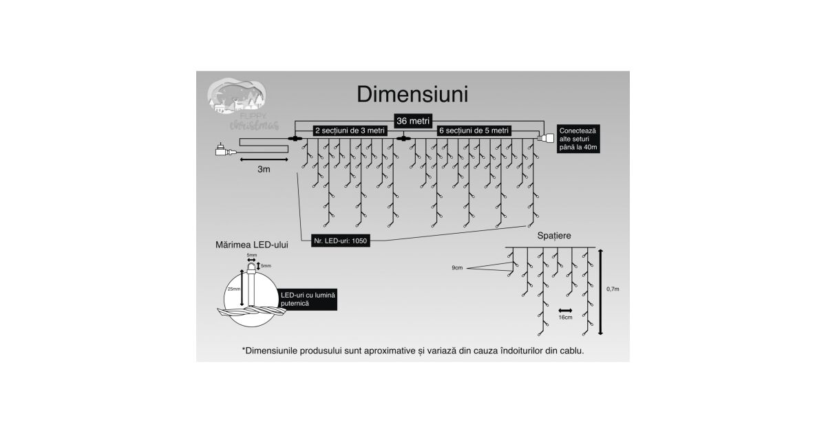 Instalatie Craciun Turturi, IP44, 36 m, 1050 Led-uri ,Perdea Franjurata, Alb cald, 8 jocuri de lumini, Transformator 31 V, Putere 9 W, Interconectabila, Interior/Exterior, Prelungitor 3 m inc Descriere