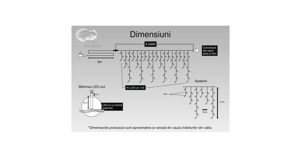 Instalatie Craciun Turturi, IP44, 5 m, 143 Led-uri ,Perdea Franjurata, Albastru, 8 jocuri de lumini, Transformator 31 V, Putere 9 W, Interconectabila, Interior/Exterior, Prelungitor 3 m inclu Descriere