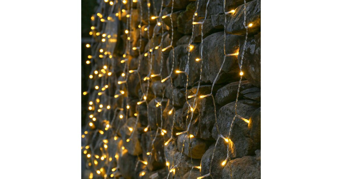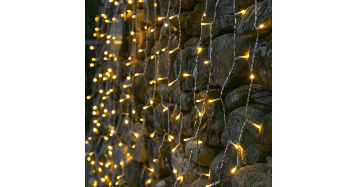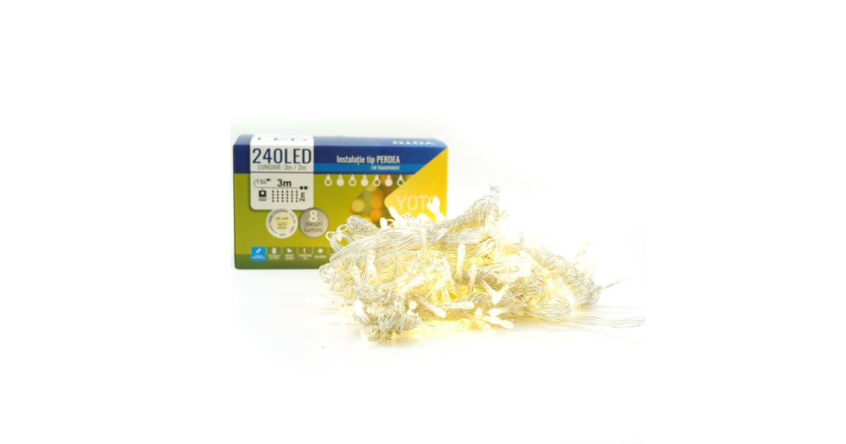 Instalatie Craciun Yoto, Tip Perdea, 3 m x 2 m, 240 LED-uri, Prelungitor 1.5 m, 8 Jocuri de Lumini, Interconectabila, Fir transparent, Interior/Exterior, Alb Cald Descriere
