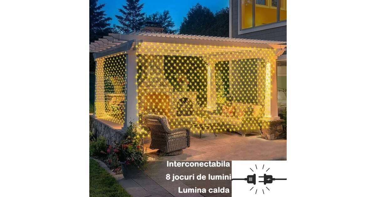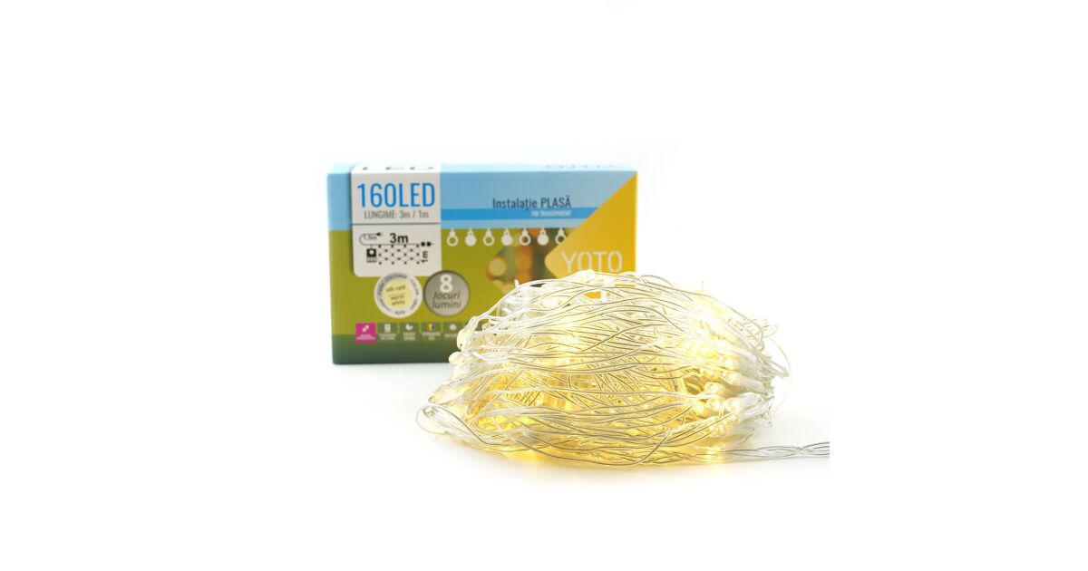Instalatie Craciun Yoto, Tip Plasa, 3 m x 1 m, 160 LED-uri, Prelungitor 1.5 m, 8 Jocuri de Lumini, Interconectabila, Fir transparent, Interior/Exterior, Alb Cald Descriere