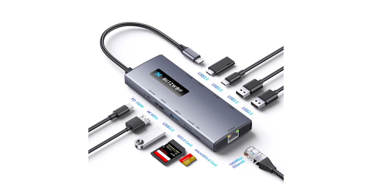 BlitzWolf BW-NEW-TH8 Hub USB 10 în 1: 1x HDMI 4K@60HZ, 5x USB 3.0, 1x RJ45, Power Delivery: 100W, cititor de carduri SD/TF Descriere