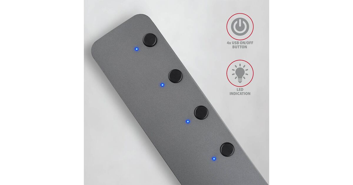 - Butoane individuale de pornire/oprire: Fiecare port poate fi controlat separat, economisind energie și evitând conectarea dispozitivelor inutile.