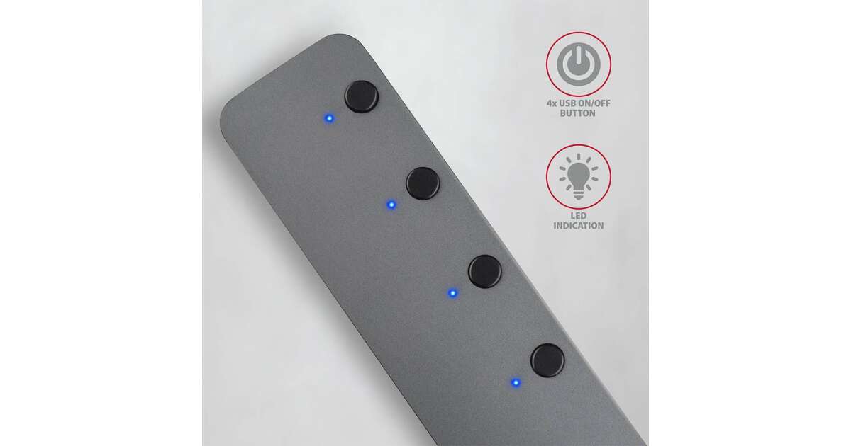 Acest hub USB din aluminiu, compact și elegant, îți oferă 4 porturi USB-A suplimentare pentru laptop sau computer, cu o viteză de 5 Gbps. Fiecare port are un buton individual de pornire/oprire cu indicator LED albastru, astfel încât poți gestiona cu ușurință dispozitivele. 💡