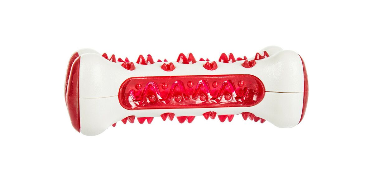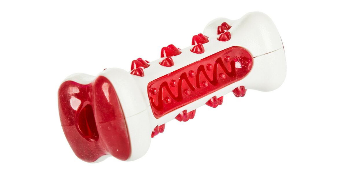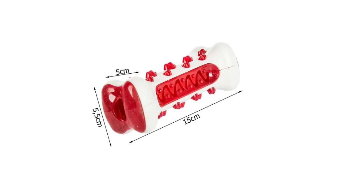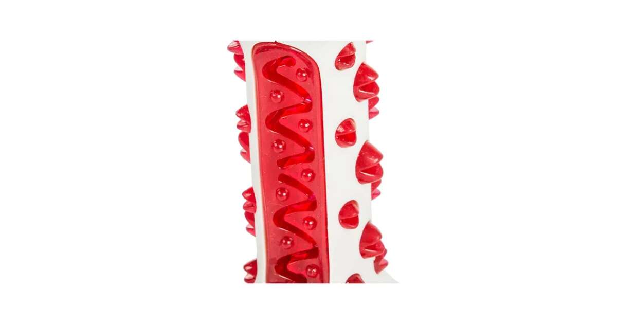 Răsfață-ți animalul de companie cu această jucărie de mestecat roșie și veselă, care are grijă și de sănătatea dinților lui! Această jucărie durabilă ajută la îndepărtarea resturilor de mâncare, a plăcii și a tartrului, în timp ce câinele tău se distrează.