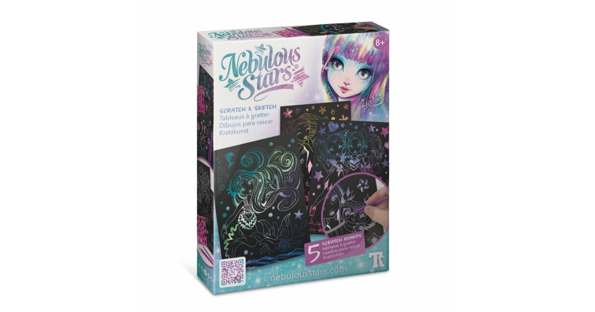 - 5 planșe Scratch & Sketch cu ilustrații tematice Nebulous Stars, gata de a fi transformate în creații colorate.