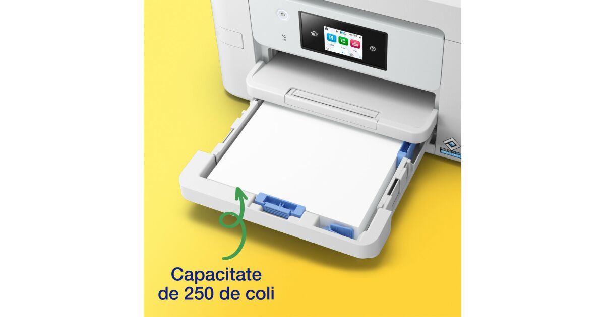 - Tavă hârtie mare capacitate: 250 de coli, pentru mai puține reîncărcări. 📄