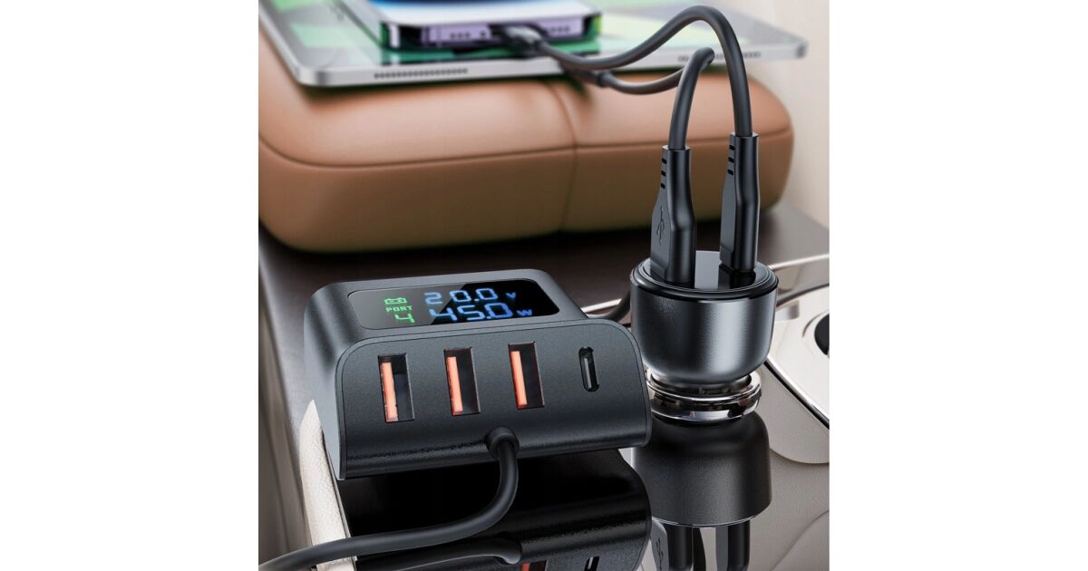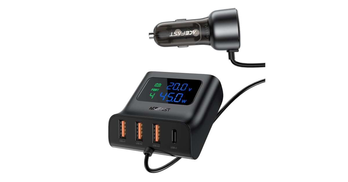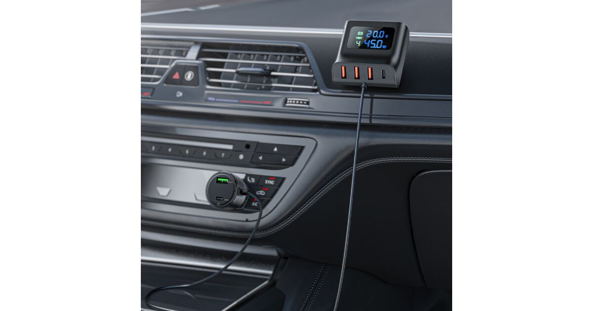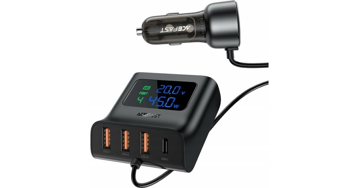 Cu încărcătorul auto rapid Acefast B11 poți încărca simultan până la șase dispozitive, datorită celor 4 porturi USB-A și 2 porturi USB-C. Display-ul digital integrat afișează în timp real puterea și tensiunea de încărcare pentru fiecare port.