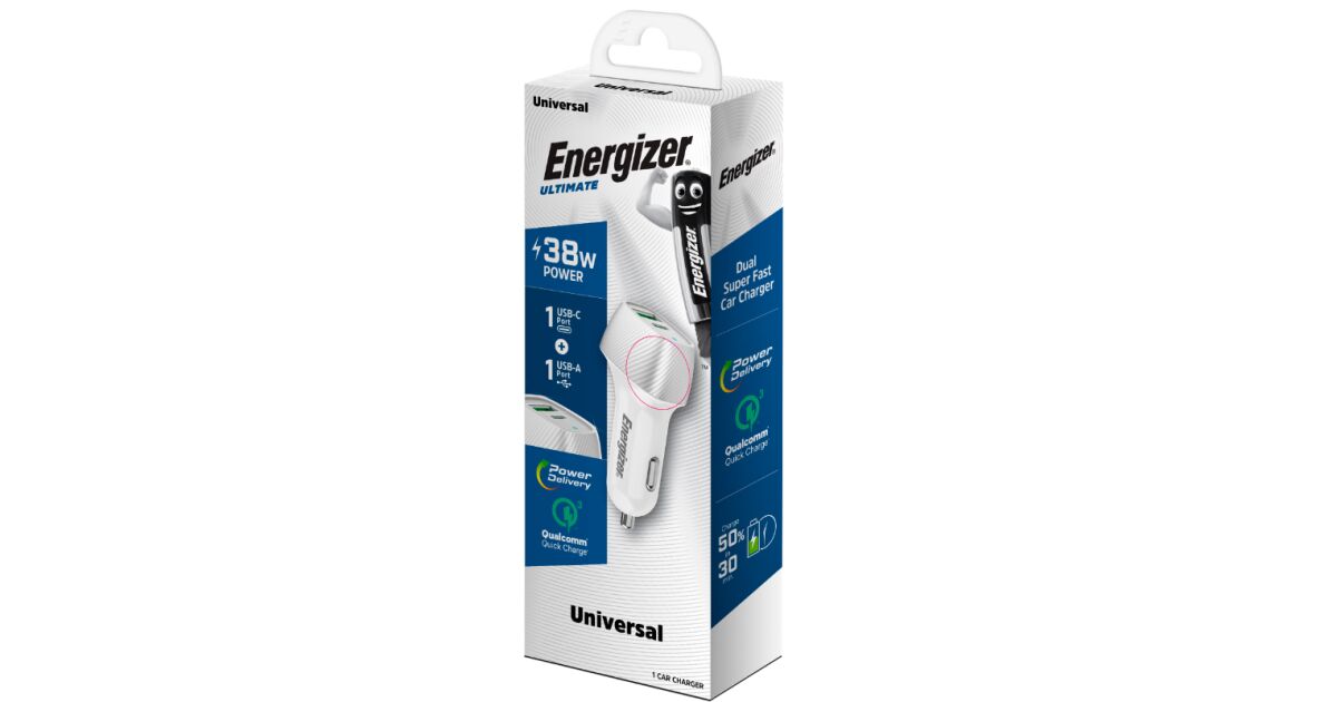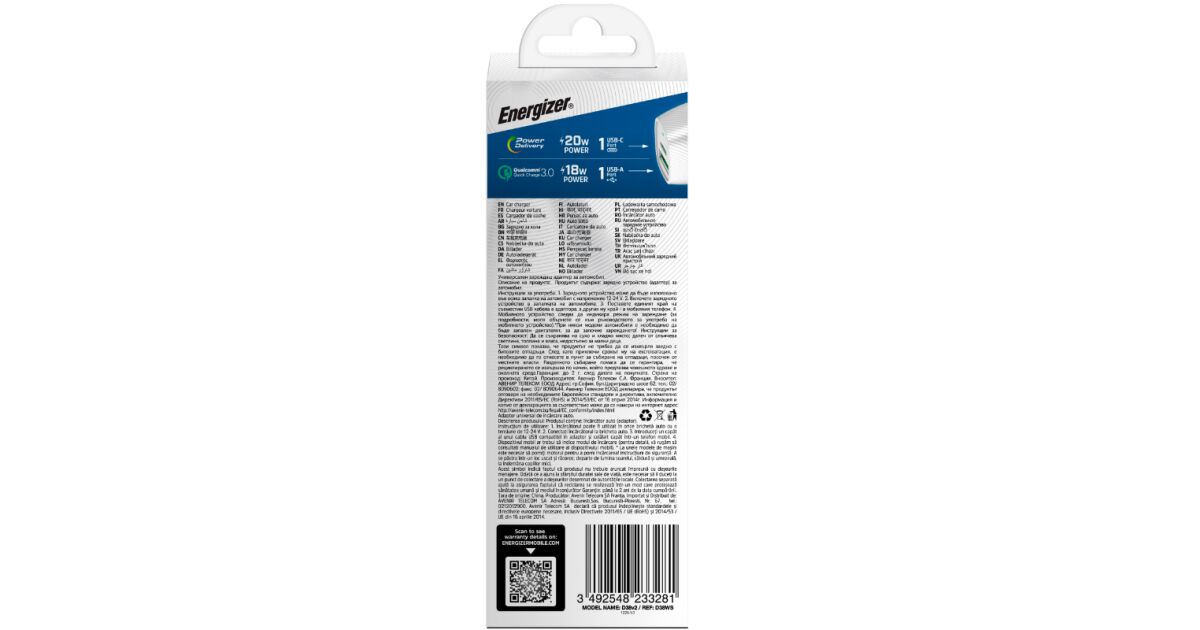 Incarcator auto Energizer PowerDelivery, 38W QC 3.0, 1 USB A + 1 USB C, Argintiu/Alb