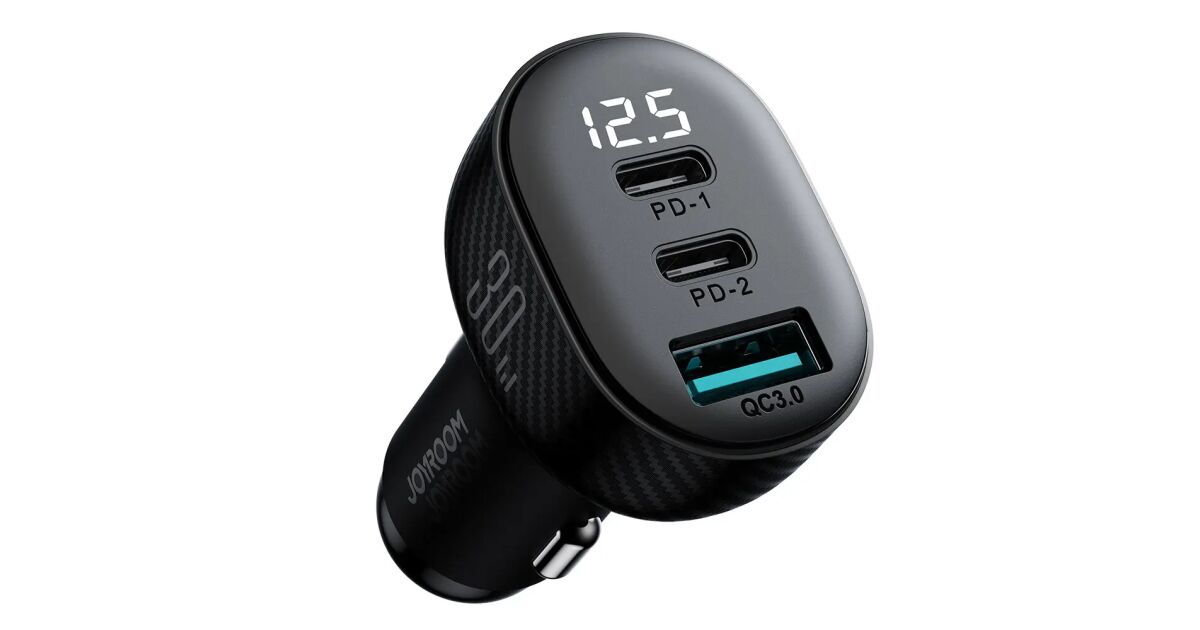 Зарядно за кола Joyroom JR-CCD04, 30W, 2x USB-C, USB-A, с дисплей, черно Descriere