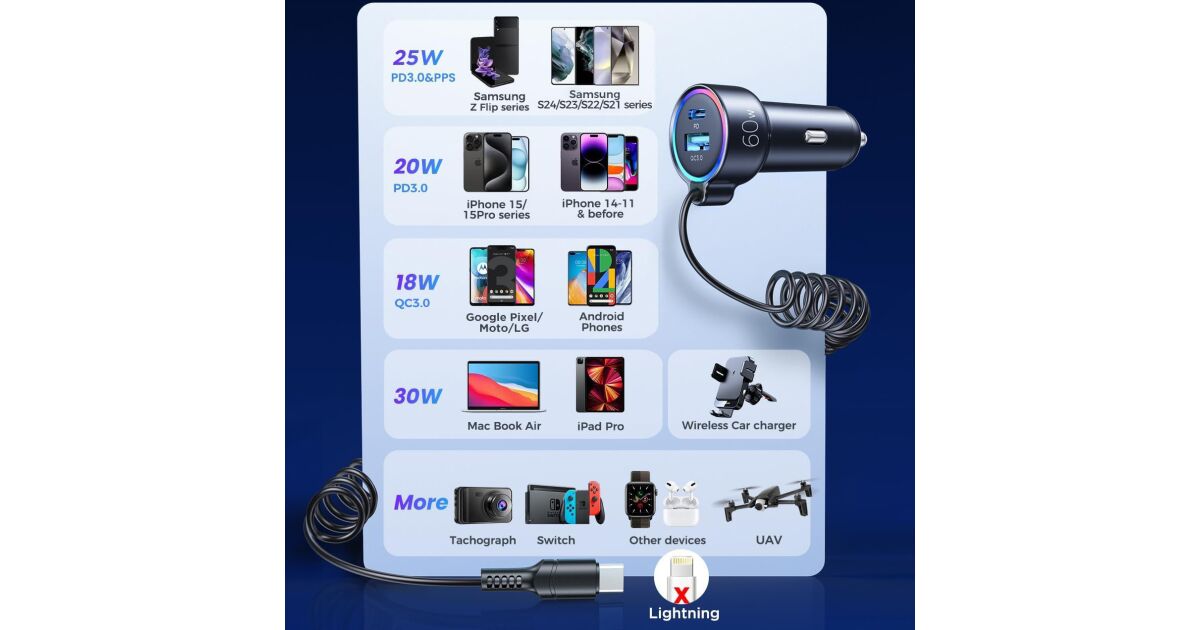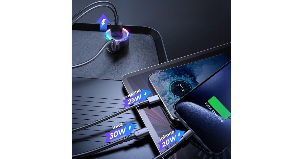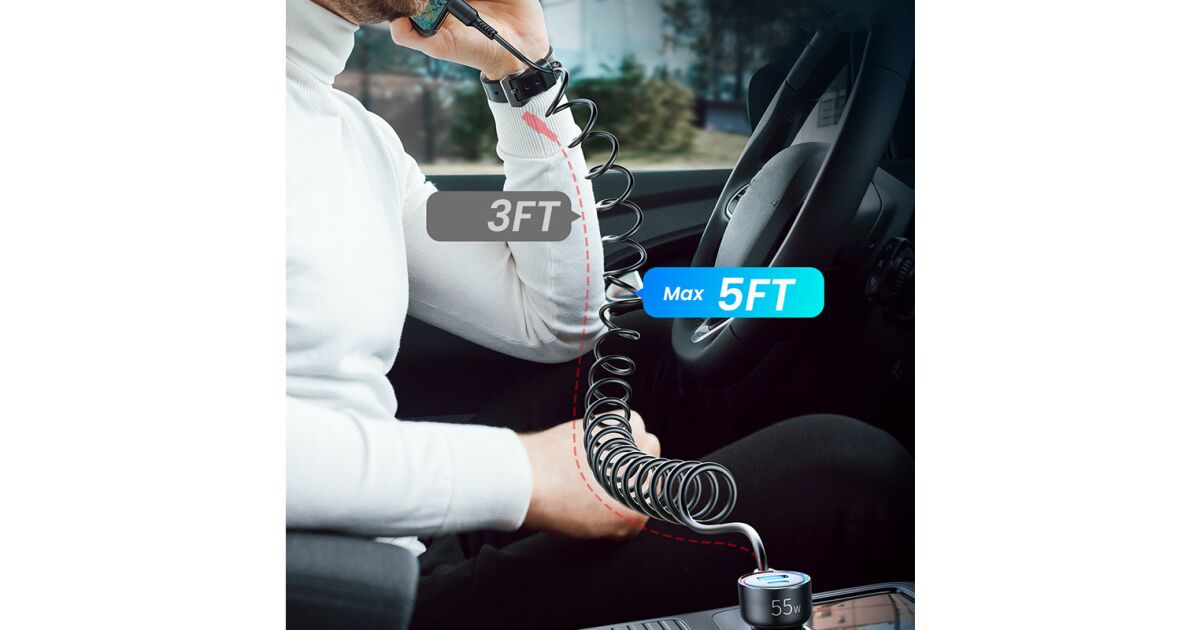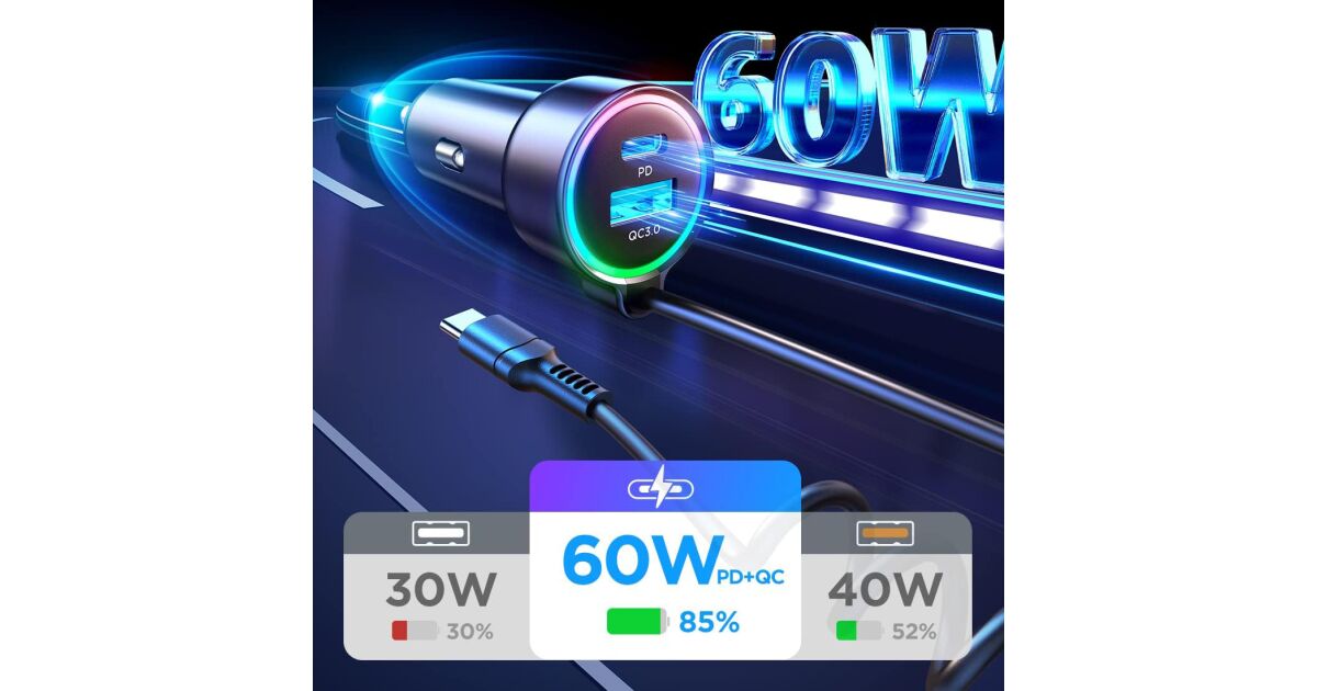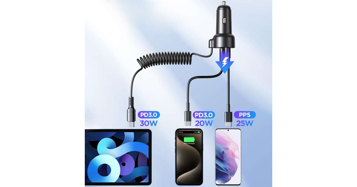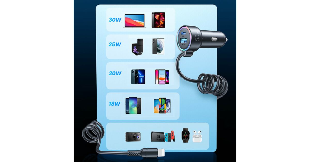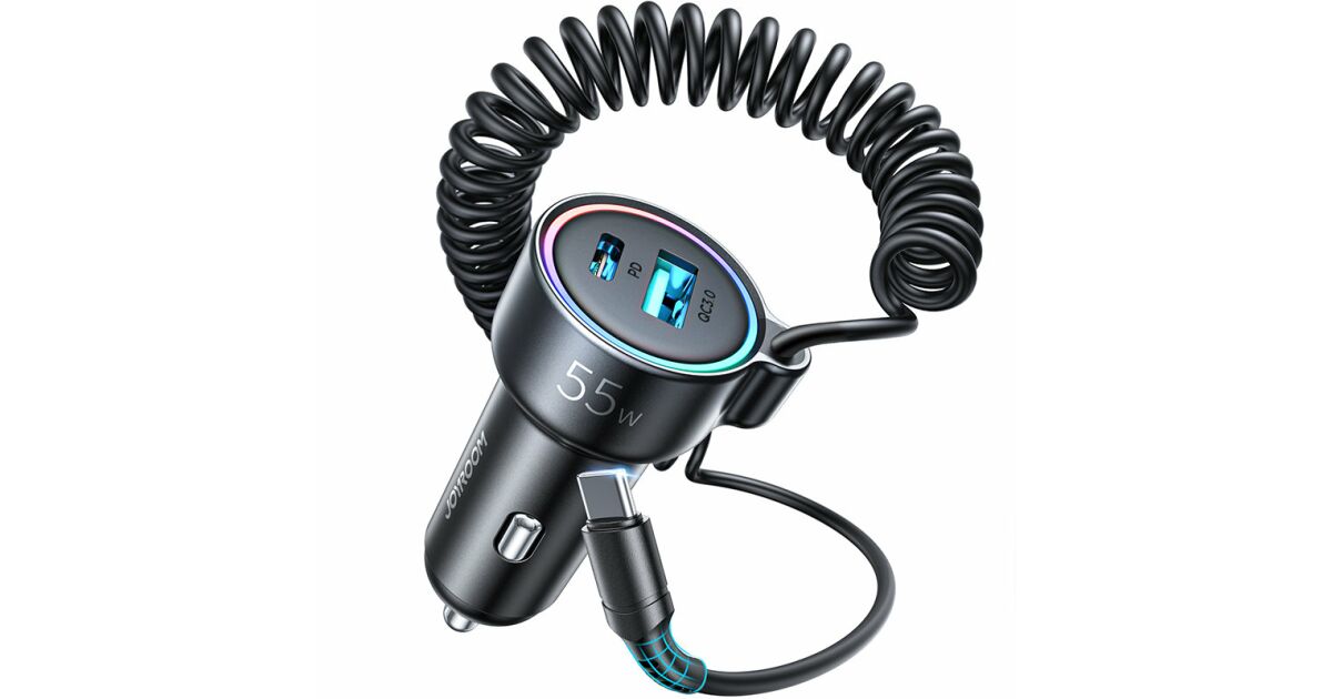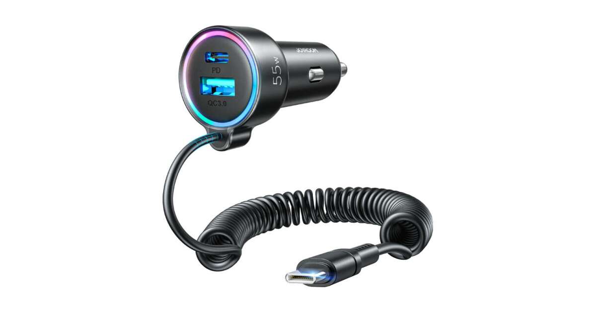 Acest încărcător auto Joyroom e soluția perfectă dacă vrei să-ți încarci dispozitivele și când ești pe drum. Cu puterea maximă de 55W, îți poți încărca telefonul, tableta sau alte dispozitive USB-C și USB fulgerător de repede. Cablul integrat de 1,5 metri e mereu la îndemână, iar poți încărca simultan până la 3 dispozitive!