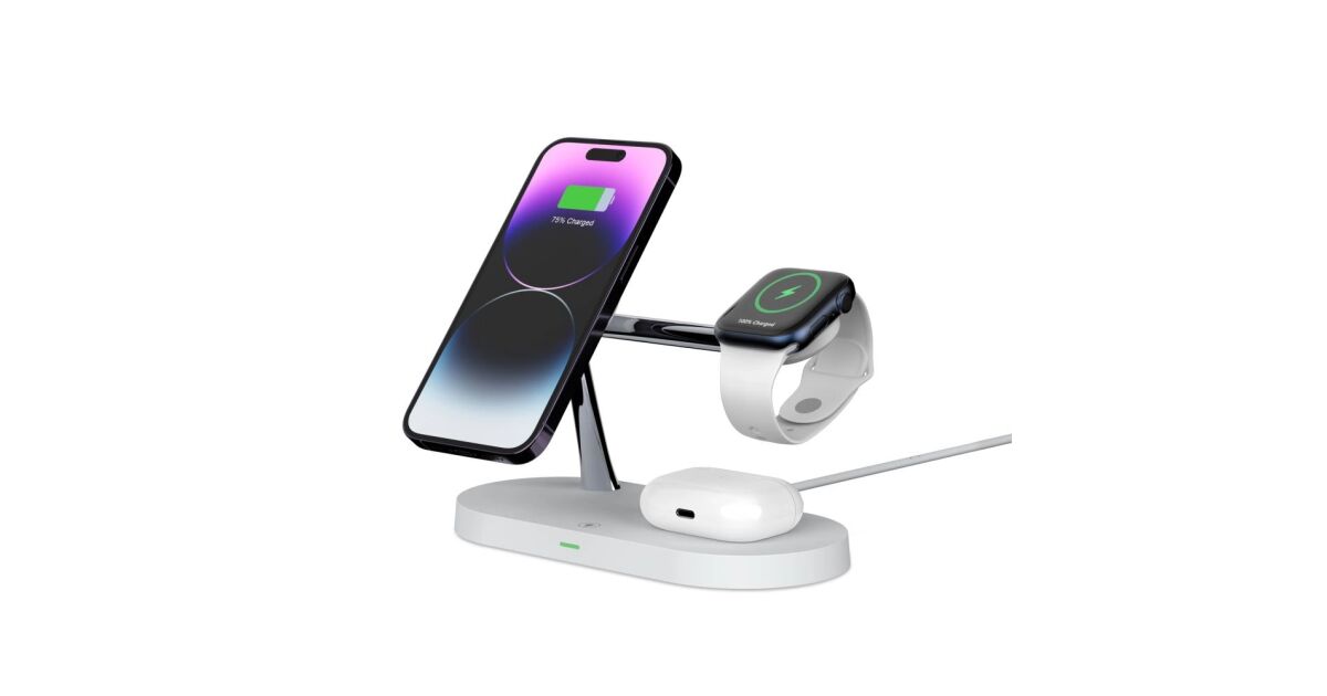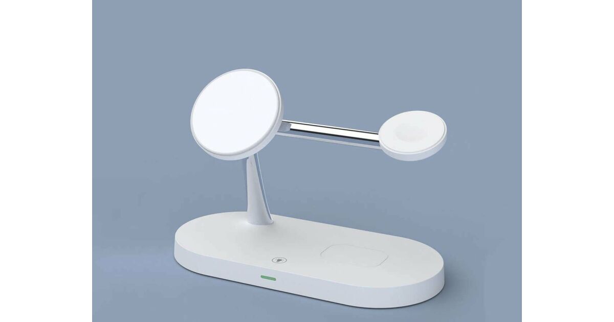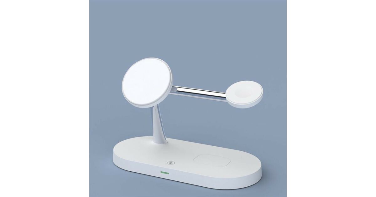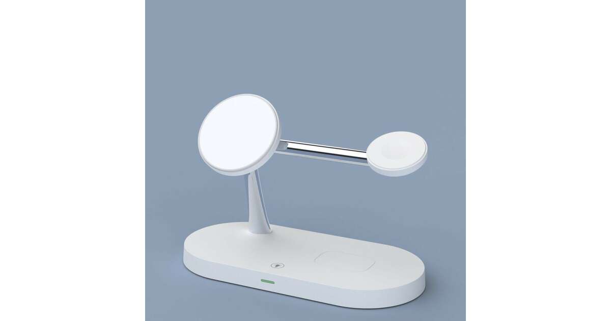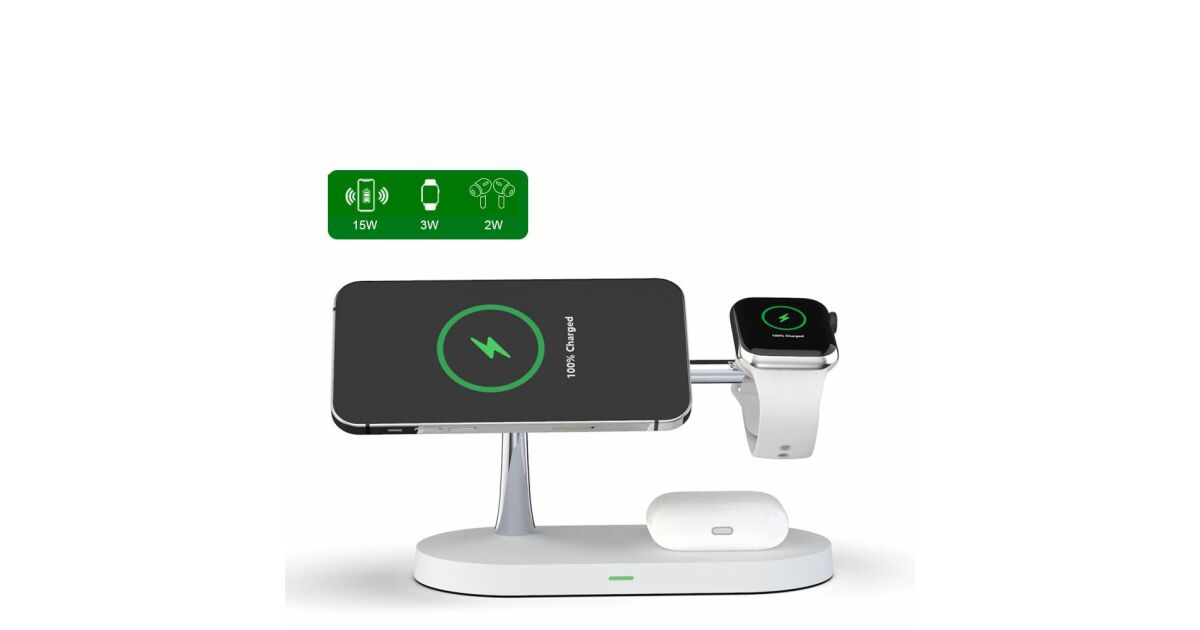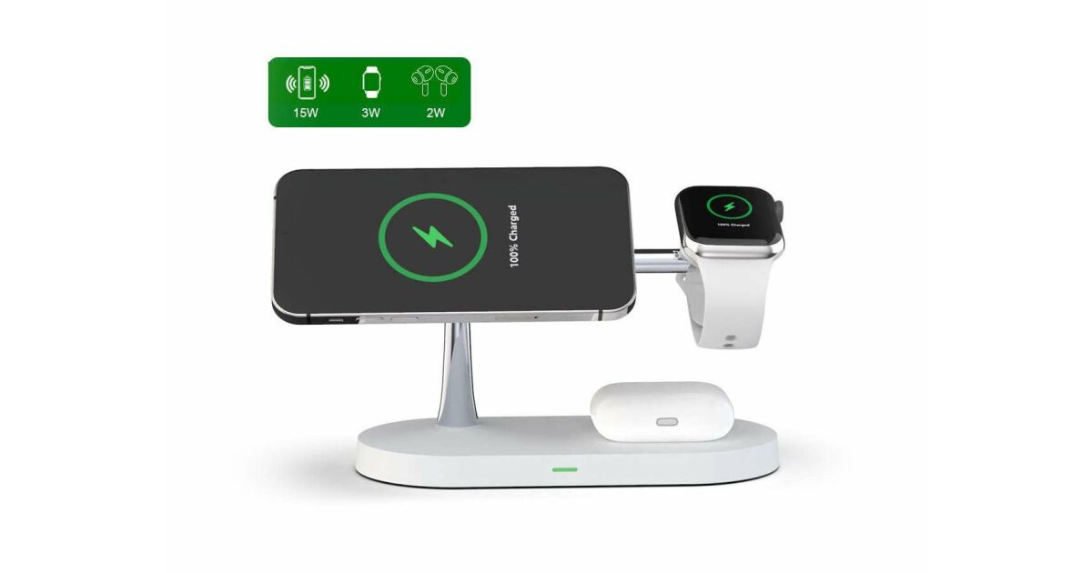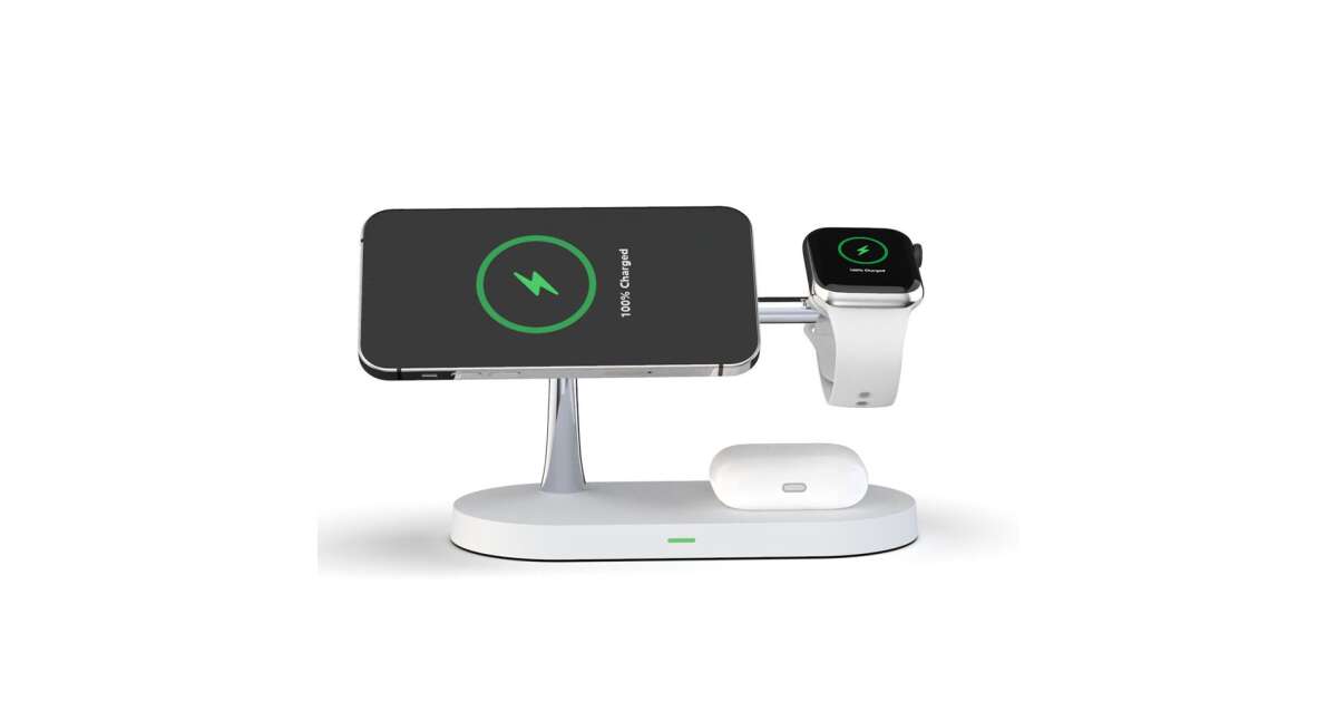 Această stație de încărcare wireless multifuncțională poate încărca simultan trei dispozitive: iPhone (compatibil MagSafe), Apple Watch și AirPods. Designul modern, cu finisaj mat, oferă un aspect elegant, în timp ce designul modular permite o configurare flexibilă a încărcării.