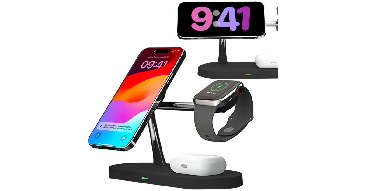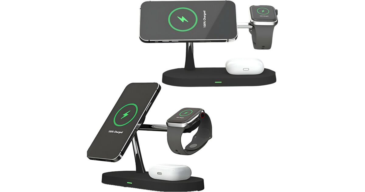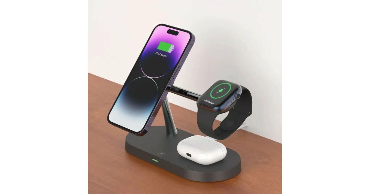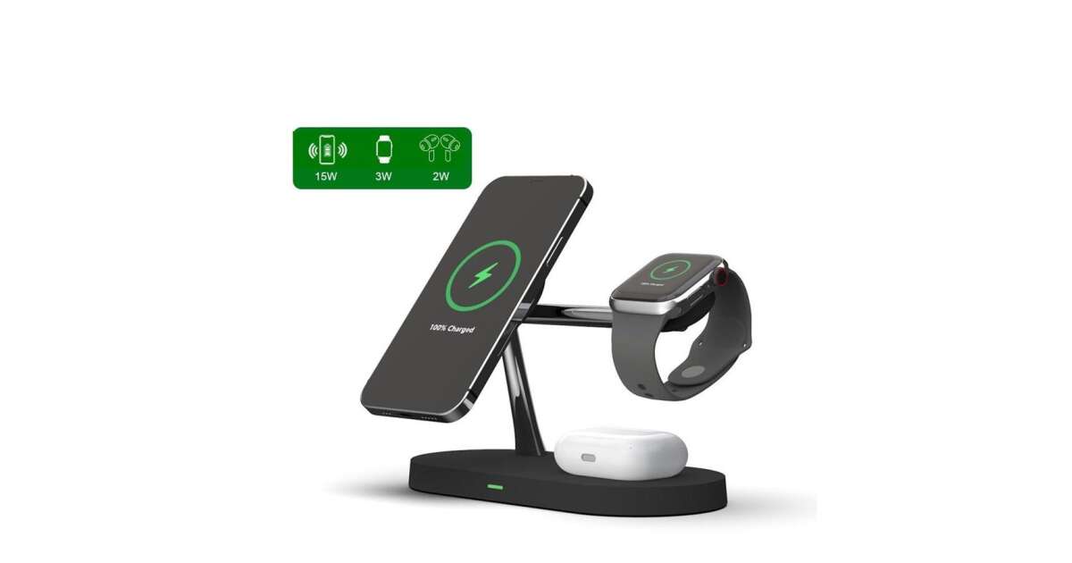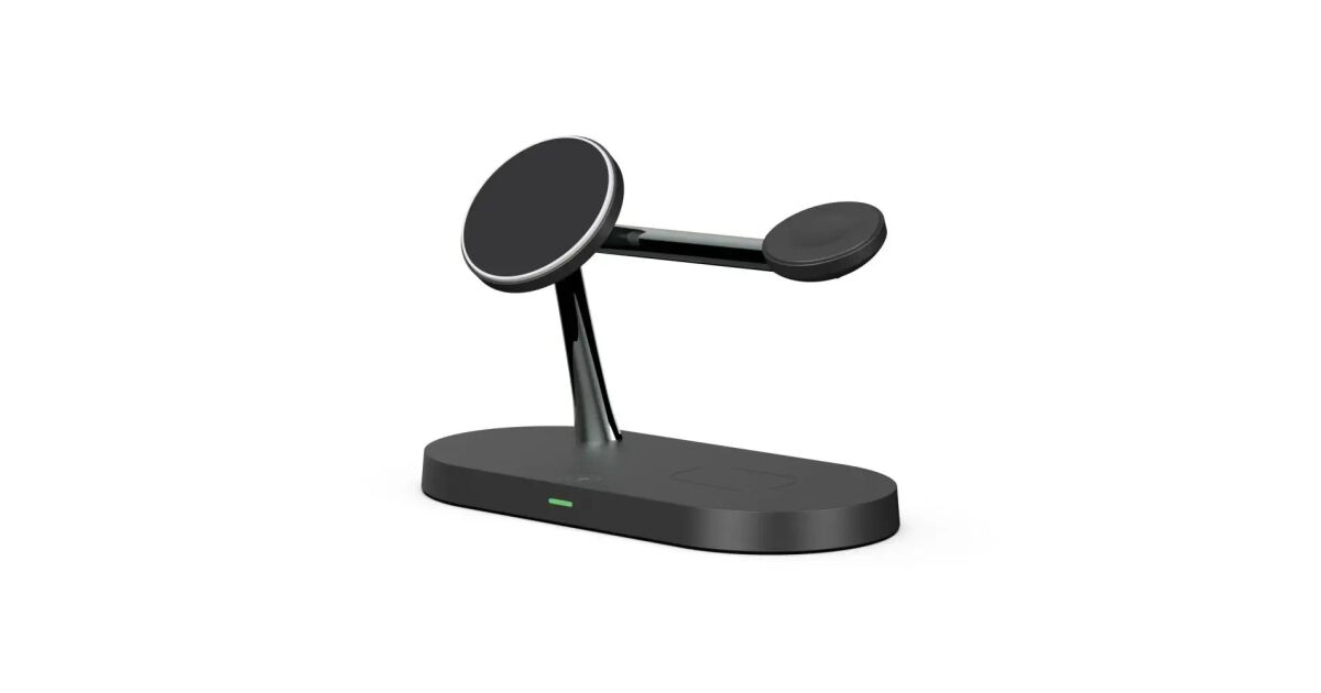 Această stație de încărcare wireless multifuncțională poate încărca simultan trei dispozitive: iPhone (compatibil MagSafe), Apple Watch și AirPods. Are un design elegant, cu finisaj mat negru și un indicator LED al încărcării, controlat printr-un buton tactil. Datorită designului modular, puteți încărca dispozitivele în diferite configurații.