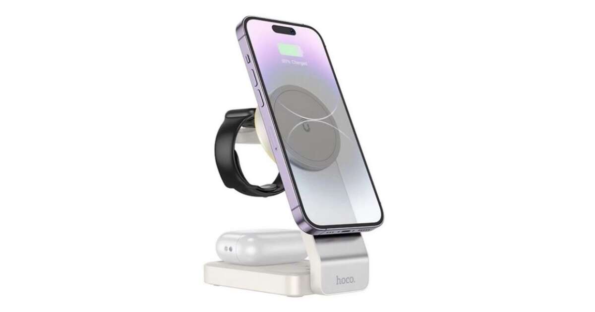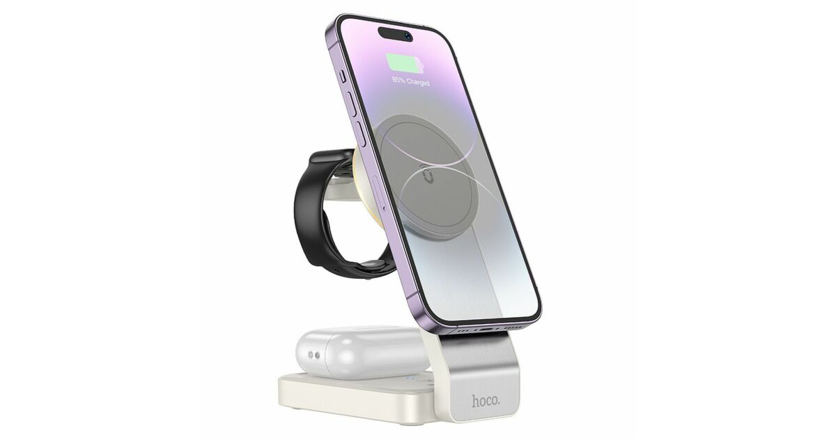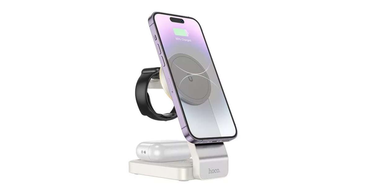 Stand de încărcare wireless 3 în 1 HOCO: Încarcă-ți iPhone-ul, Apple Watch-ul și AirPod-urile simultan! 📱⌚️🎧