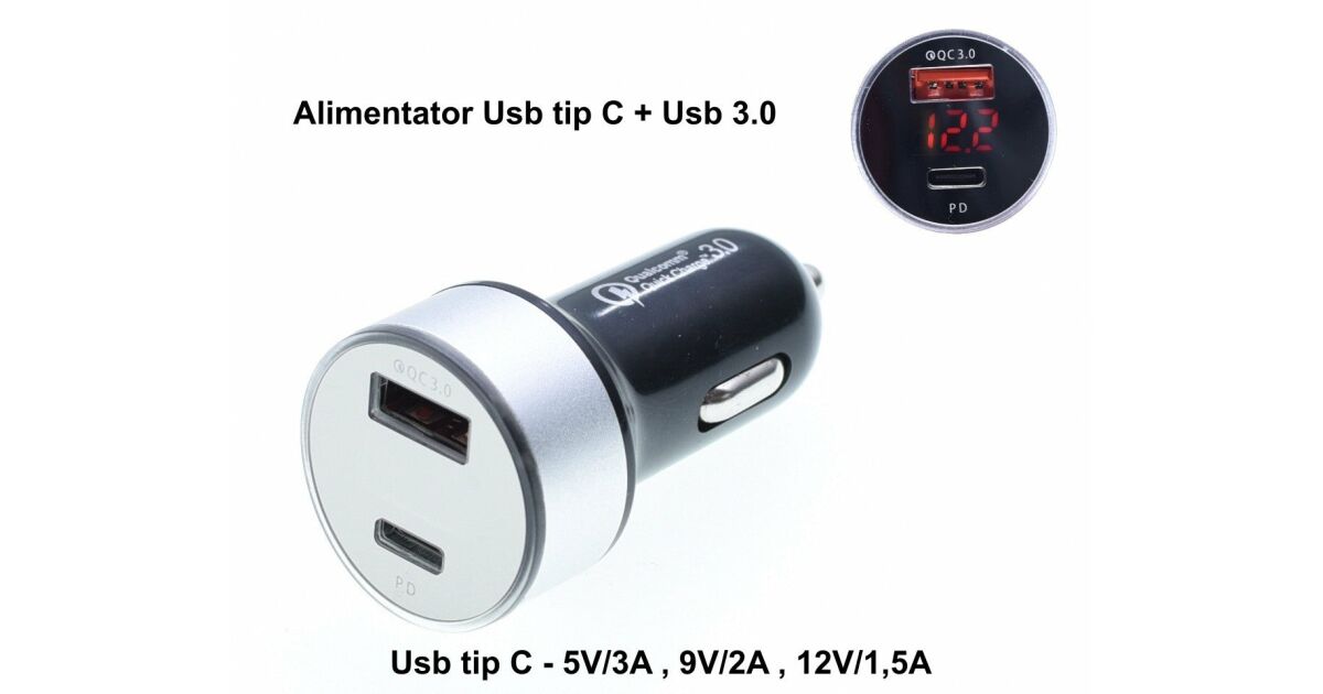 Încărcător Auto Qualcom Usb 3.0 + PD-Usb tip C COD : INC-1224-QC30 Încărcător de telefon sau electronice cu alimentare la bricheta auto 12V-24V DC. Acest încărcător are doua prize USB: una este USB 3.0 mama și cealaltă este USB Tip C. Alimentator ce are afișajul digital de indicare a tensiuniI de alimentare. Accesoriu ce se folosește frecvent pentru încărcarea telefonului, tabletei sau diferitelor deviceuri care se alimeteaza la tensiune de 5V DC. Compatibil cu aparate: sony , samsung , apple , Motorola, Huawei , Lg , etc. Carcasa din plastic mica si robusta pentru a putea fi folosit fără sa încurce. Detalii tehnice: Tensiune de alimentare: 12V - 24V DC Tensiuni de ieșire: USB 3.0: 3,65V/6,5V-3A, 6,5V/9V-2A, 9V-12V-1,5A USB tip C: 5V-3A, 9V-2A, 12V-1,5A Dimensiuni: 60mm x ø 32/24 mm Conținut pachet: 1 x Încărcător Auto Qualcom USB 3.0 + USB Tip C