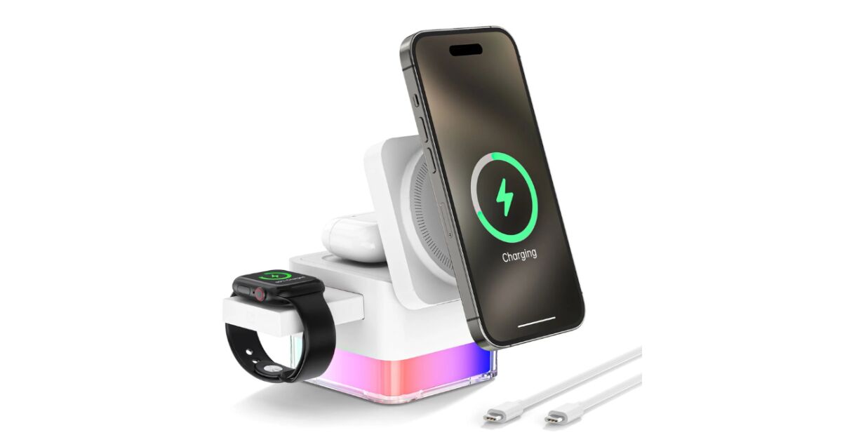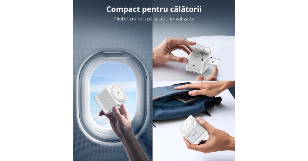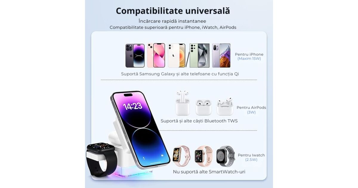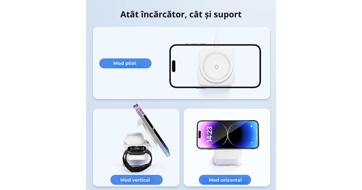 Încărcător Wireless 3 în 1 – Compact, Eficient, și ElegantAcest încărcător wireless 3 în 1 este soluția ideală pentru utilizatorii de iPhone, Samsung, Apple Watch și AirPods (cu funcție de încărcare wireless). Cu un design compact și funcțional, se potrivește perfect atât acasă, cât și în călătorii.Caracteristici principaleÎncărcare simultană pentru trei dispozitiveCompatibil cu iPhone 12/13/14/15 (inclusiv modelele Pro/Pro Max), dispozitive Samsung și alte telefoane cu funcție de încărcare wireless.Oferă suport dedicat pentru Apple Watch (Series 3 până la Ultra) și AirPods (modele cu carcasă wireless).Moduri multiple de utilizareÎți permite să-ți încarci telefonul în poziție verticală, perfect pentru apeluri video, sau orizontală, ideală pentru filme și multitasking.Designul pliabil îl face ușor de transportat, economisind spațiu în geantă sau valiză.