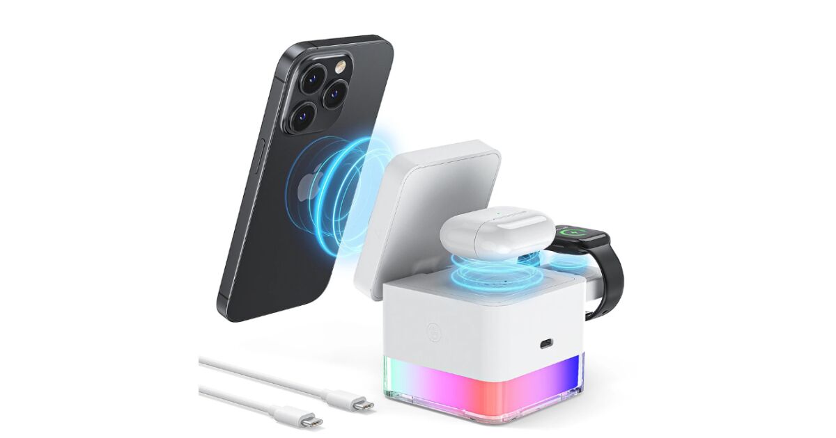 Incarcator wireless Gelle fast charger, statie incarcare 3 in 1 cu lumina LED, Incarcare rapida 15W pentru telefon, casti, smart watch, compatibil cu Airpods, cu Apple watch toate seriile si