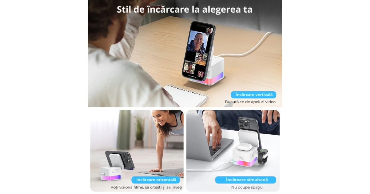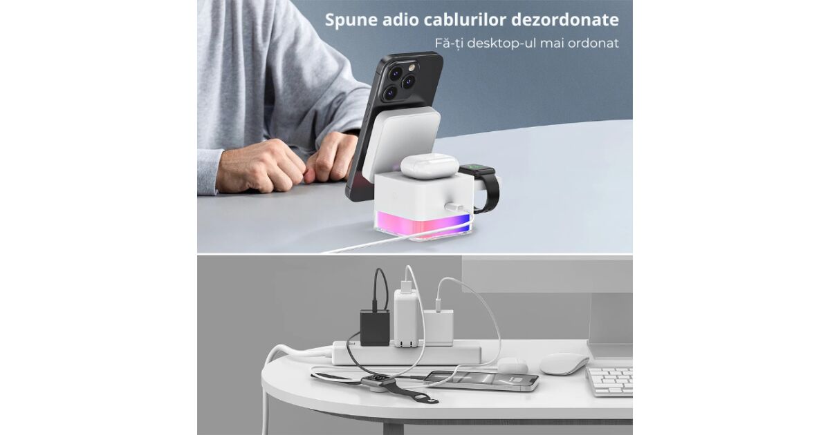 De ce să-l alegi?Fără bătăi de cap – Elimină aglomerația de cabluri de pe birou sau noptieră.Versatilitate – Perfect atât pentru birou, cât și pentru călătorii.Eficiență și stil – Îți încarcă rapid toate dispozitivele esențiale, oferind în același timp un aspect modern și minimalist.Dacă folosești dispozitive Apple și Samsung și vrei un încărcător care să combine practicabilitatea cu eleganța, acest model 3 în 1 este exact ceea ce ai nevoie.