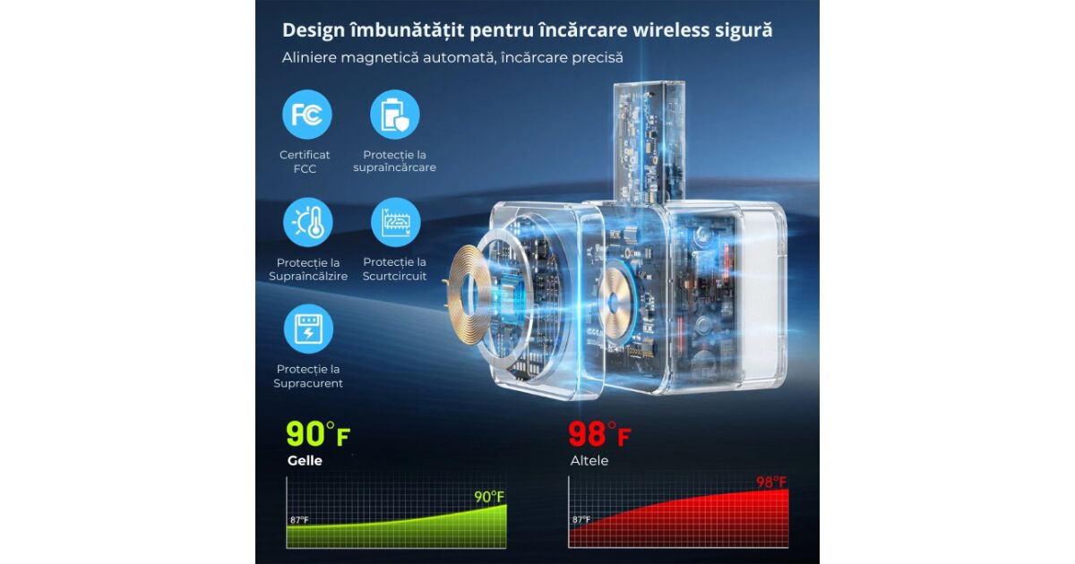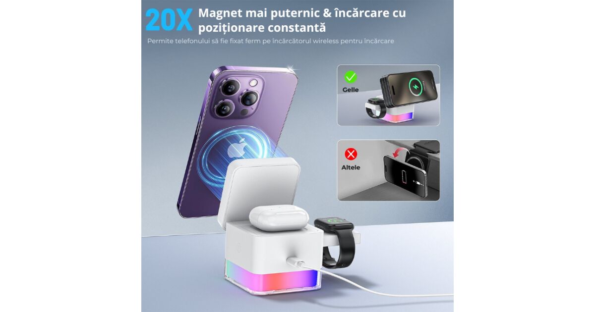 Lumină LED ambientală ajustabilăBază iluminată cu moduri colorate și lumină caldă pentru un somn relaxant.Funcția LED poate fi dezactivată, fiind ideală pentru utilizare pe timp de noapte.Tehnologie de siguranță avansatăCertificare FCC și protecție împotriva supraîncărcării, supraîncălzirii și scurtcircuitelor.Magneți puternici care asigură o aliniere precisă pentru încărcare constantă.