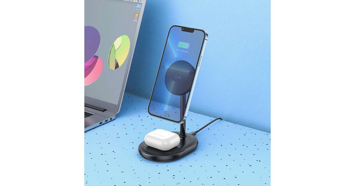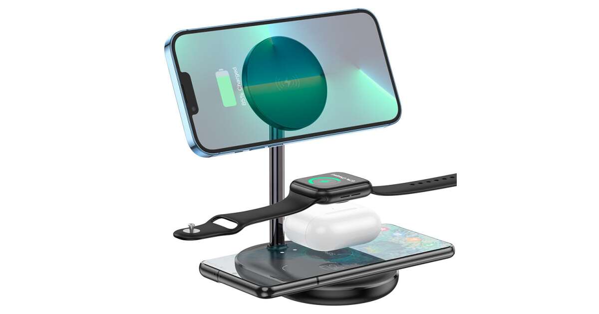 Această stație de încărcare wireless Hoco Noble 3 în 1 elegantă și practică îți încarcă simultan telefonul, Apple Watch-ul și căștile wireless. Nu mai trebuie să te chinui cu mai multe încărcătoare! ✨
