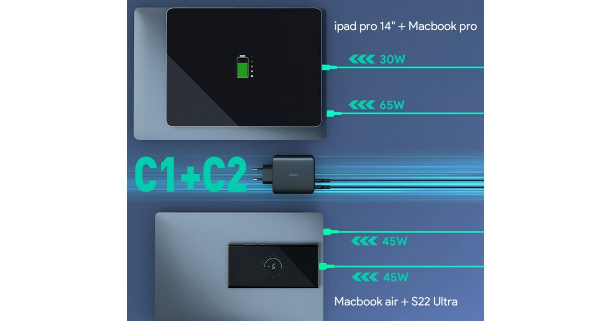 Acest încărcător de rețea compact, dar puternic, AUKEY Omnia II Mix S de 100W îți va revoluționa experiența de încărcare. Datorită tehnologiei de ultimă generație GaN (nitrură de galiu), este cu 20% mai mic decât încărcătoarele tradiționale, dar poate încărca până la patru dispozitive simultan. Distribuția dinamică a energiei asigură că fiecare dispozitiv se încarcă la o viteză optimă.
