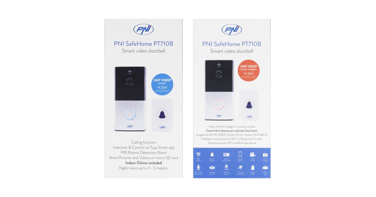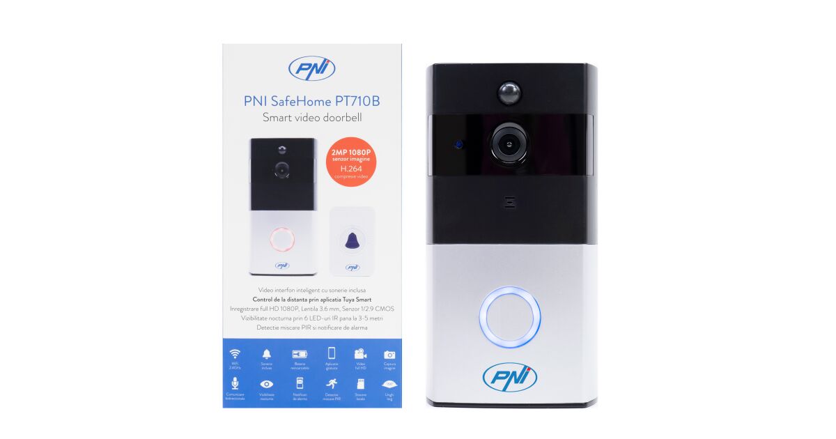 PNI SafeHome PT710B este un interfon video inteligent care oferă imagini HD și se integrează cu sistemul smart home Tuya Smart. Primești notificări pe telefon când cineva sună sau când este detectată mișcare în fața ușii.